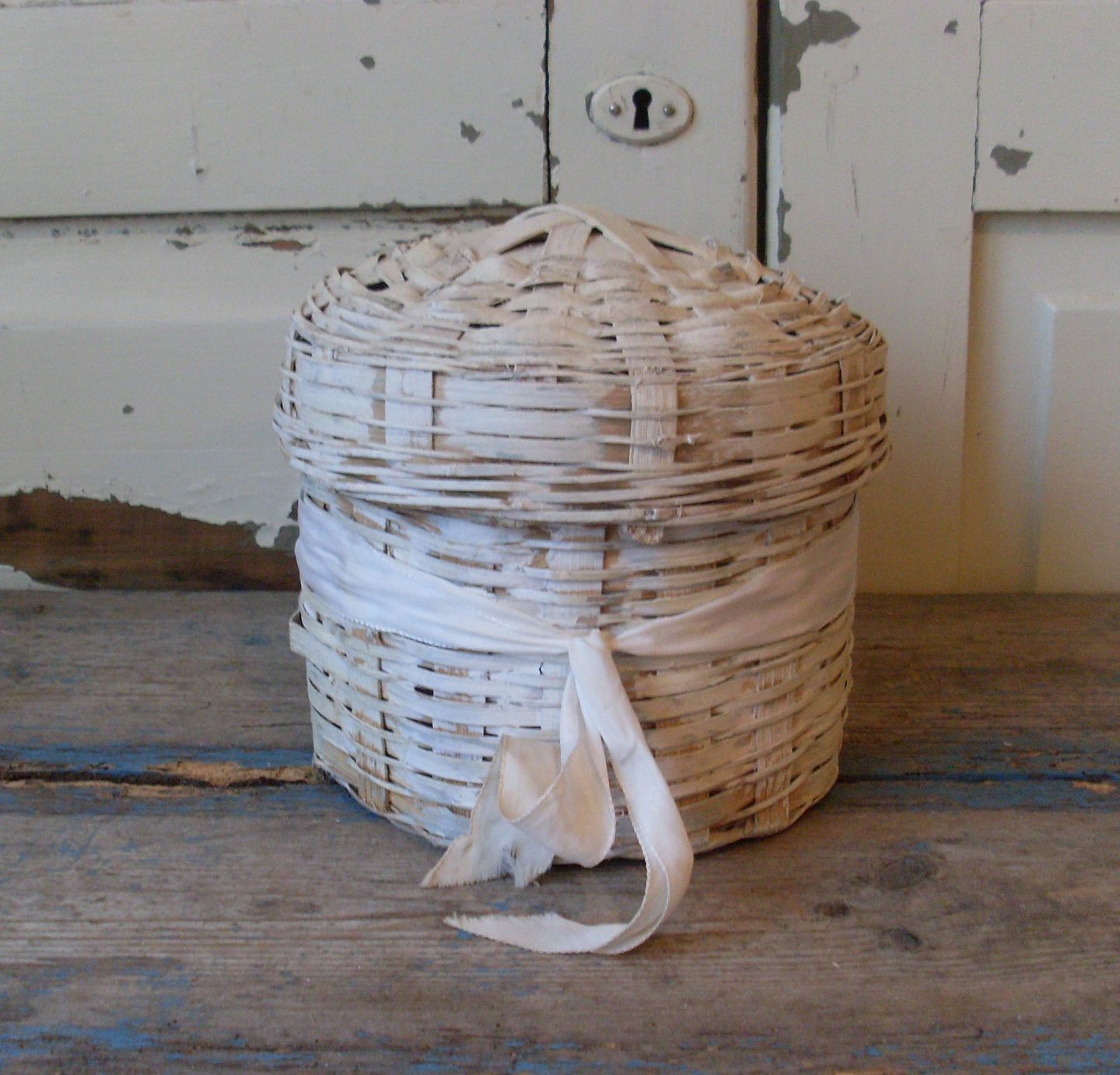 Smuk hvidmalet flet kurv med låg.