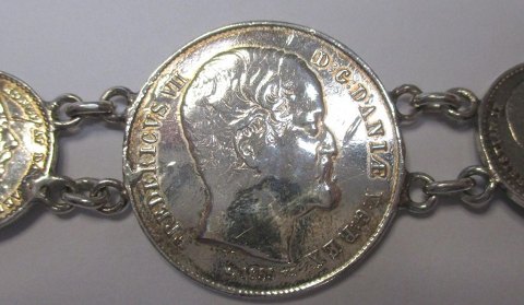 Danish bracelet of silver coins, 19. / 20. century. Among other things, Half rigsdaler from 1855 and 6 pcs. 25 øre from 1905. L .: 19 cm.