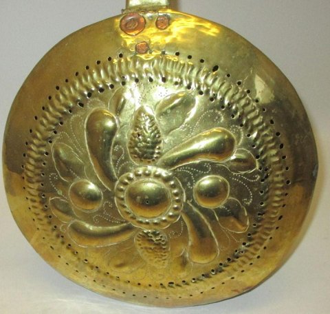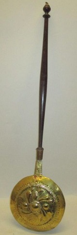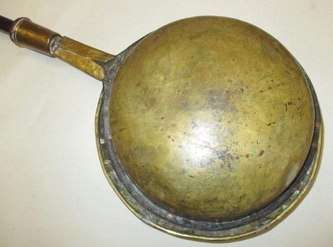 Barok varme bækken, 18. årh. Danmark. Messing med træhåndtag. Låg med blomsterdekorationer. L.: 102 cm. Dia. bækken: 26 cm. Ingen synlige stempler.