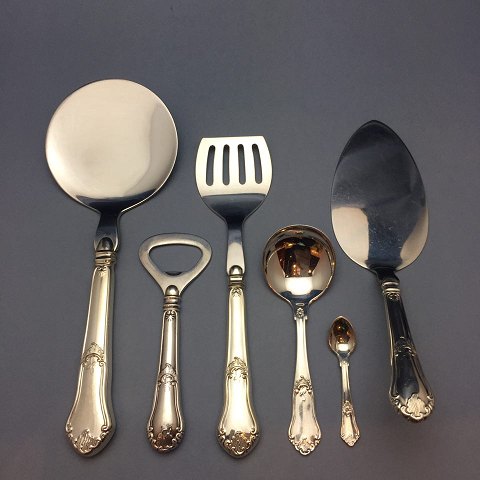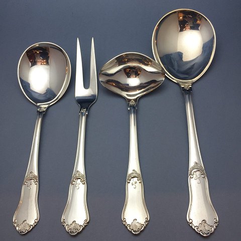| "Rosenholm". Hallmarked silver cutlery set for 12 persons, 77 pieces in all. Comprising: 12 dinner knives, 12 dinner forks, 12 dessert spoons, 12 pastry forks and 12 coffee spoons. 1 serving spoon 25 cm, 2 serving spoons 21 cm, 2 roast forks, 1 cake server, 2 sauce spoons, 1 hering fork, 1 marmelade spoons, 1 server with round bowl, 1 bottle opener, 3 salt spoons and 2 cold cuts forks.