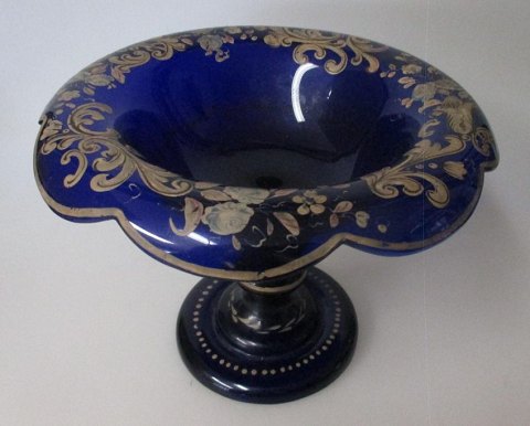 Glass bowl in cobalt blue glass with enamel decoration, Germany, around 1900. Round foot, molded strain and bowl with wavy edge. Decorated with scattered flowers and rocailles. H .: 13.5 cm. Dia .: 18 cm.