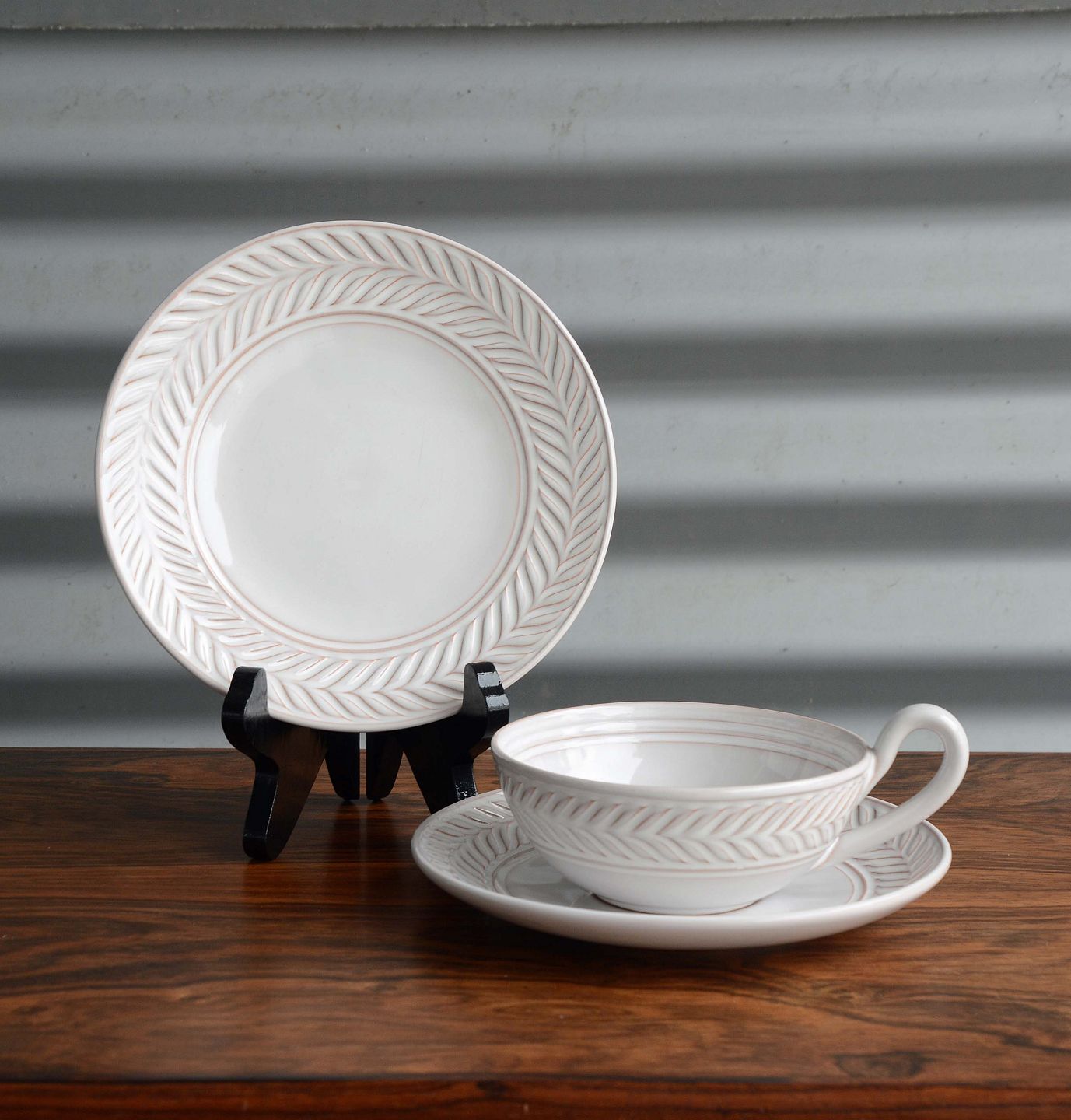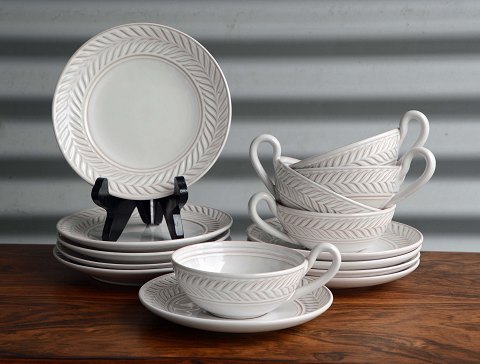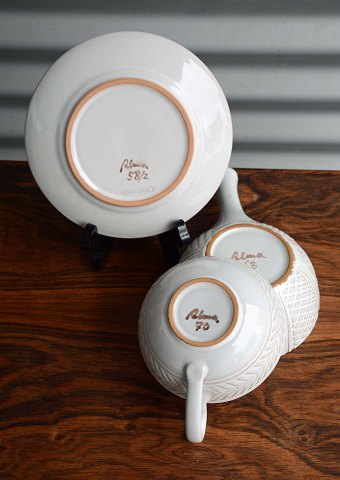 Text available in Danish: Keramik stel model Alma. Sæt med 5 tekopper, 5 underkopper og 5 kagetallerkner samt et lågfad.
