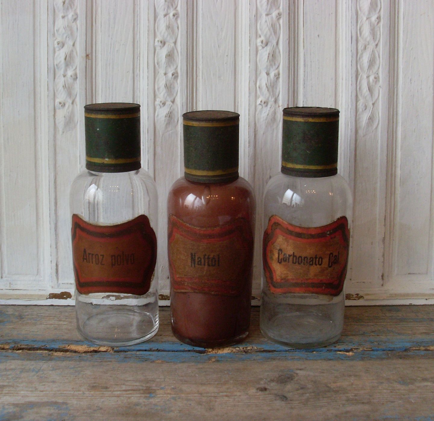 Dekorative gamle apotekerflasker med grønmalede metal låg.
