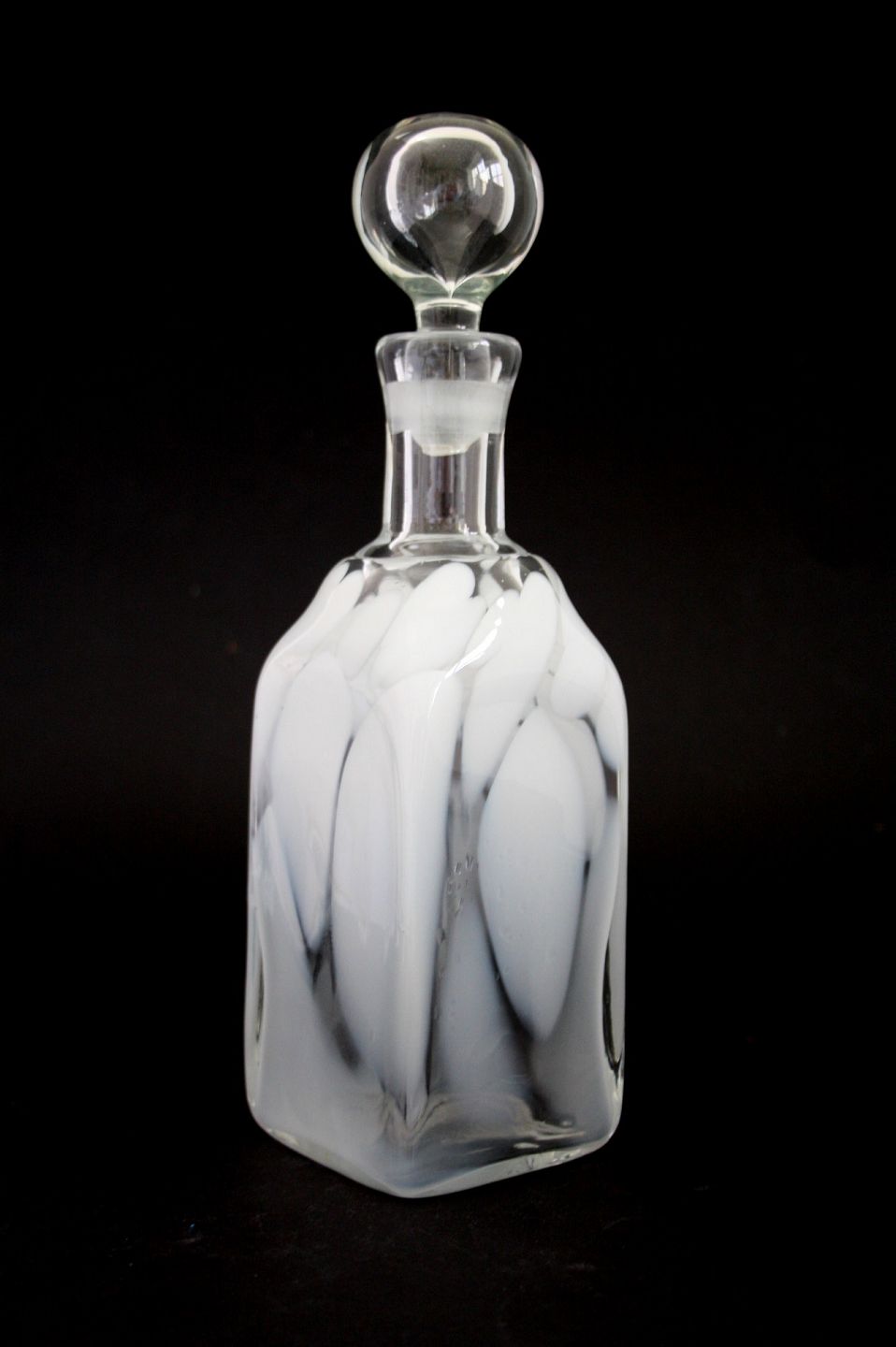Karaffel med opal hvidt glas med hul prop, højde 27 cm. Fin og hel stand. Pris: 425 kr.