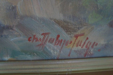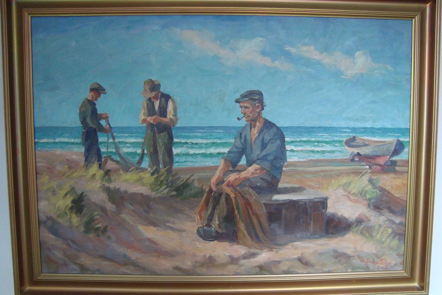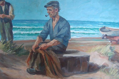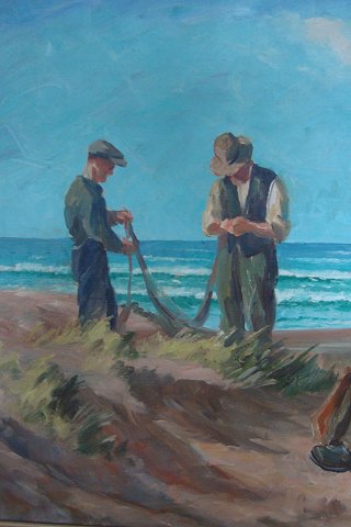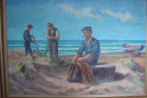 Maleri af Christian Aabye-Talge - Fiskere rengør garn på stranden.