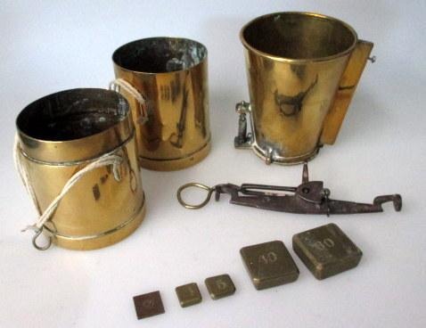 Corn Measure in brass, 19th century. Consisting of weight and two containers. In addition funnel and weight gram weights. For the determination of the moisture content of the grain.