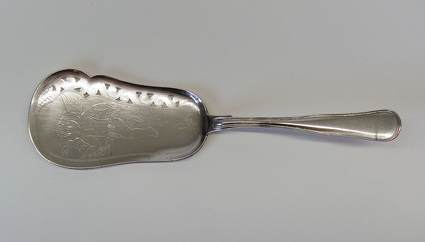 Text zugänglich auf Dänische: Antik Dobbeltriflet fiskespade smukt dekoreret med en engel med blomster krans.