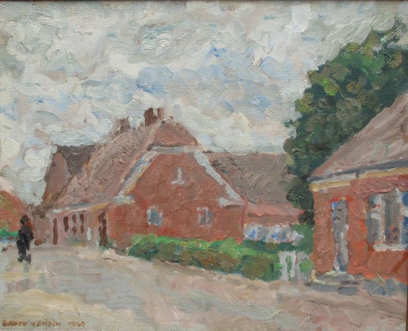 Groth-Jensen, Jens Peter (1918 - ) Danmark: Landsbygade i Lyst Gråvejr med drivende skyer.