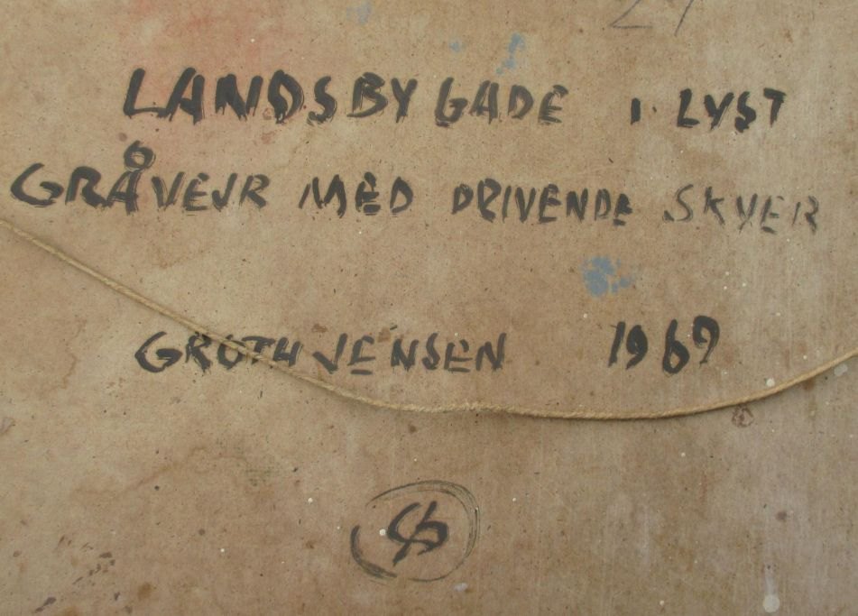 Groth-Jensen, Jens Peter (1918 - ) Danmark: Landsbygade i Lyst Gråvejr med drivende skyer. Olie på lærred/plade. Signeret: Groth Jensen 1969. 29 x 36 cm.