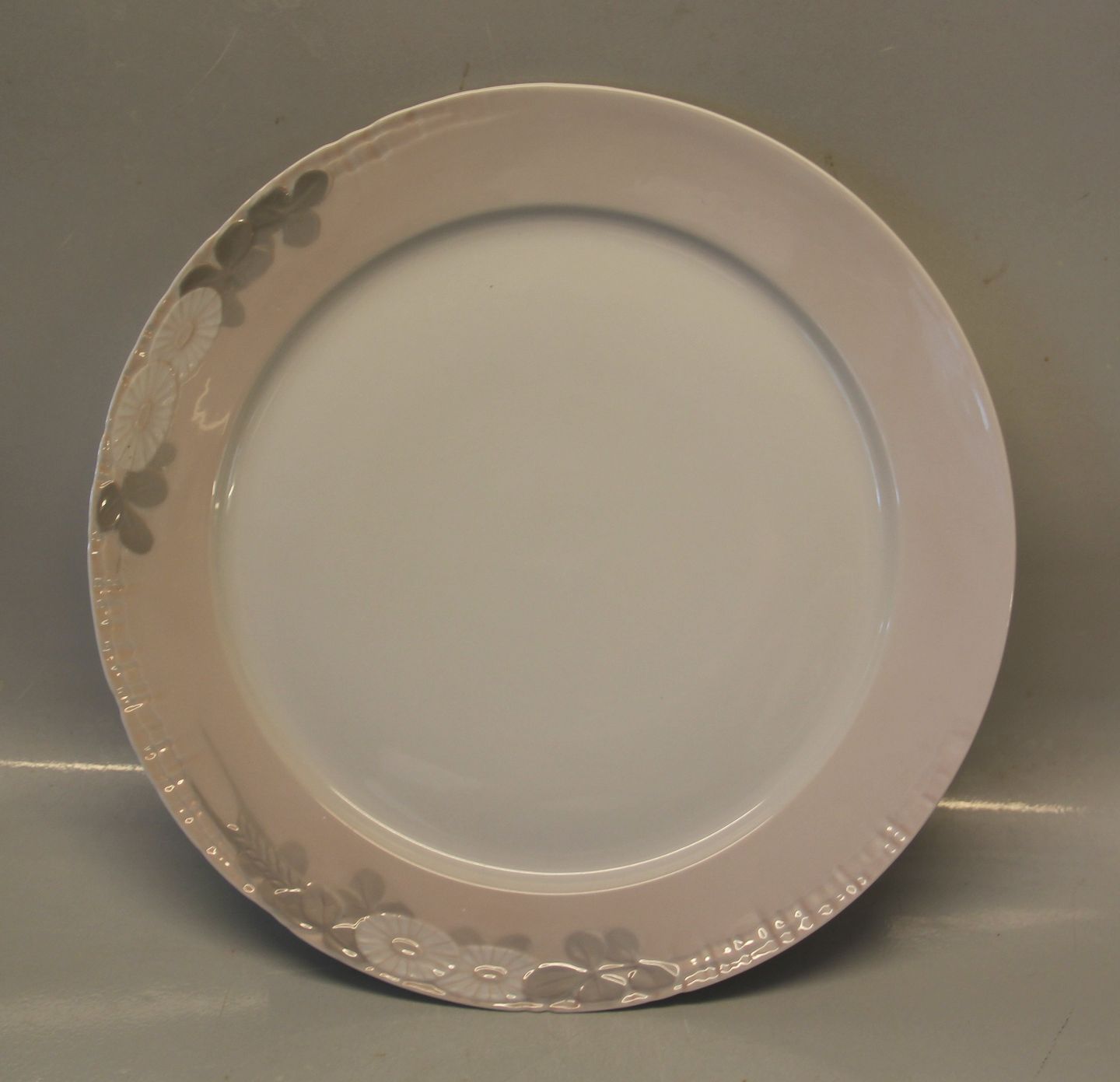 72-10012 Kgl. Stort rundt fad 33 cm, rødlig Kgl. Skærsommernats drøm rødlig # 72 og blå # 73 Marguerittestellet designet af Arnold Krogh. Med margueritter og guldsmede. Genskabt i 1970erne. Royal Copenhagen Midsummer Night's Dream