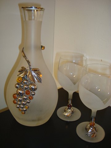 Unika karaffel m. prop og 2 glas med dekoration af Sterling sølv og indlagt rav. Designermærke G/D. Højde karaffel 27 cm, højde glas 16,5 cm