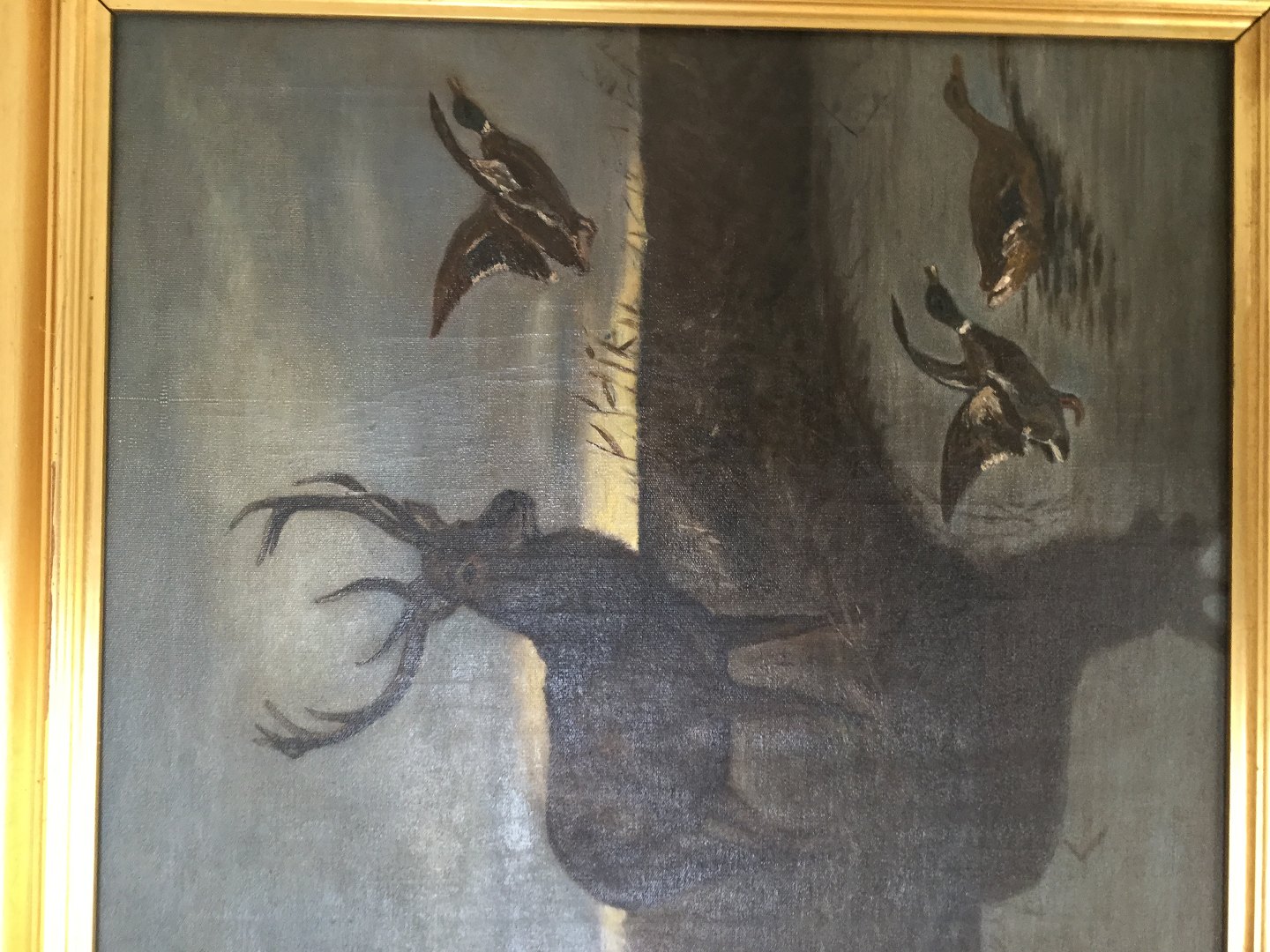 Maleri - Kronvildt ved sø i skumring med vildænder.