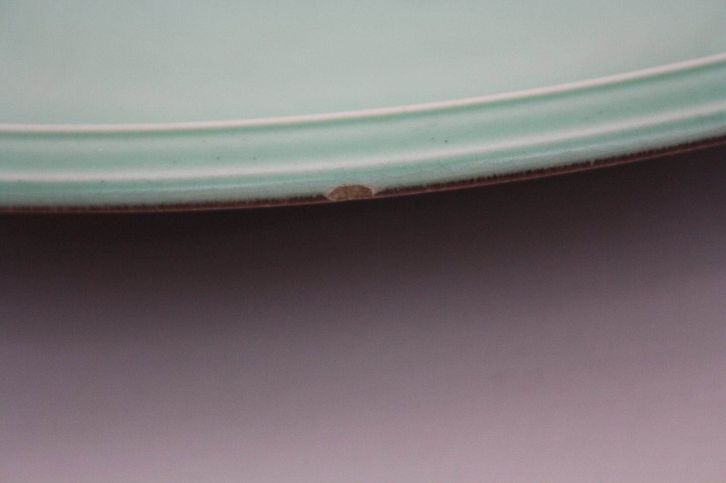 Aluminia, Solbjerg kunststengods stort mintgrønt fad med mår motiv, designet af Nils Thorsson i perioden 1935. Form.nr. 1669. Lettere overfladekrakelering og brun misfarvning. Mindre kantafslag se ekstra foto. Diameter 36 cm. Højde 4 cm. Pris: 600 kr.