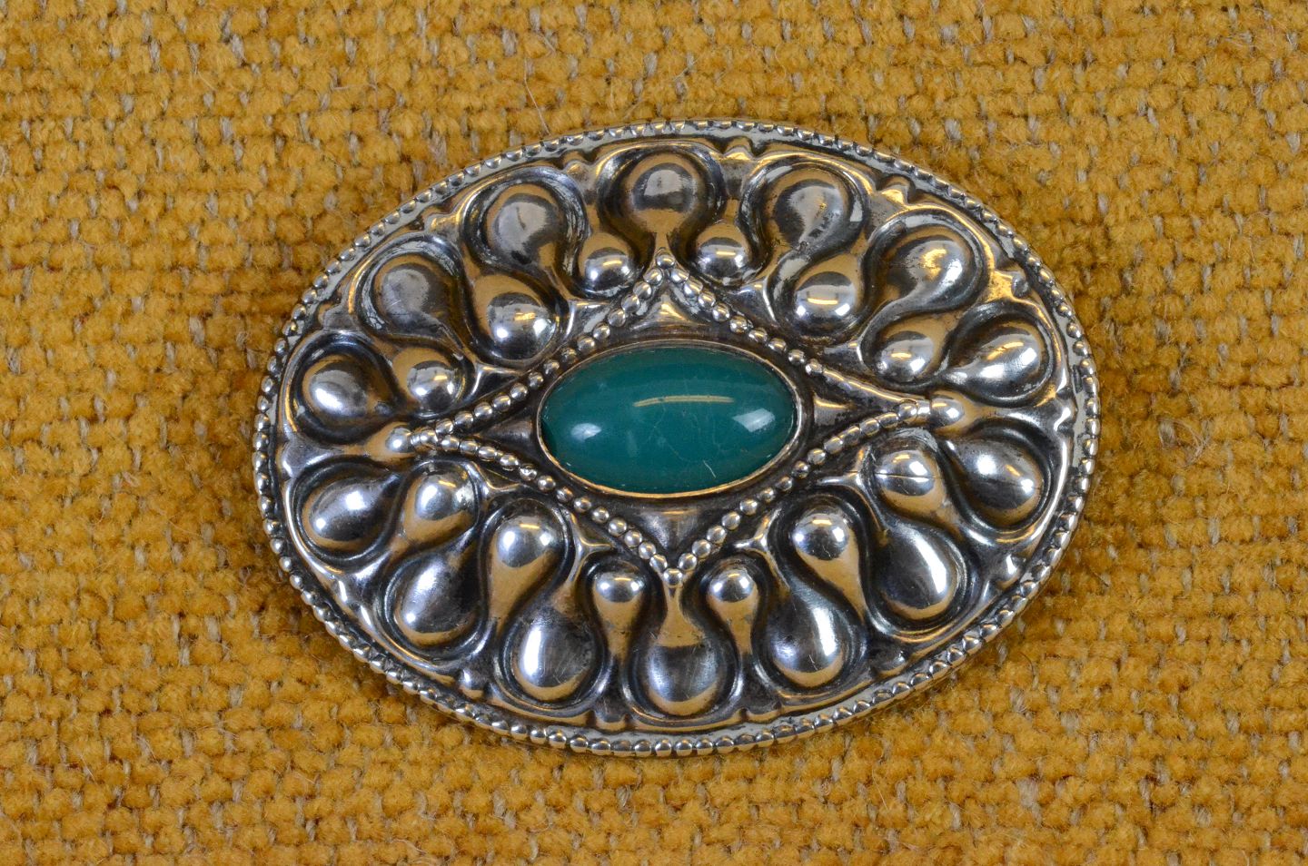 Broche skønvirke af sølv med grøn agat. Art. No. 7