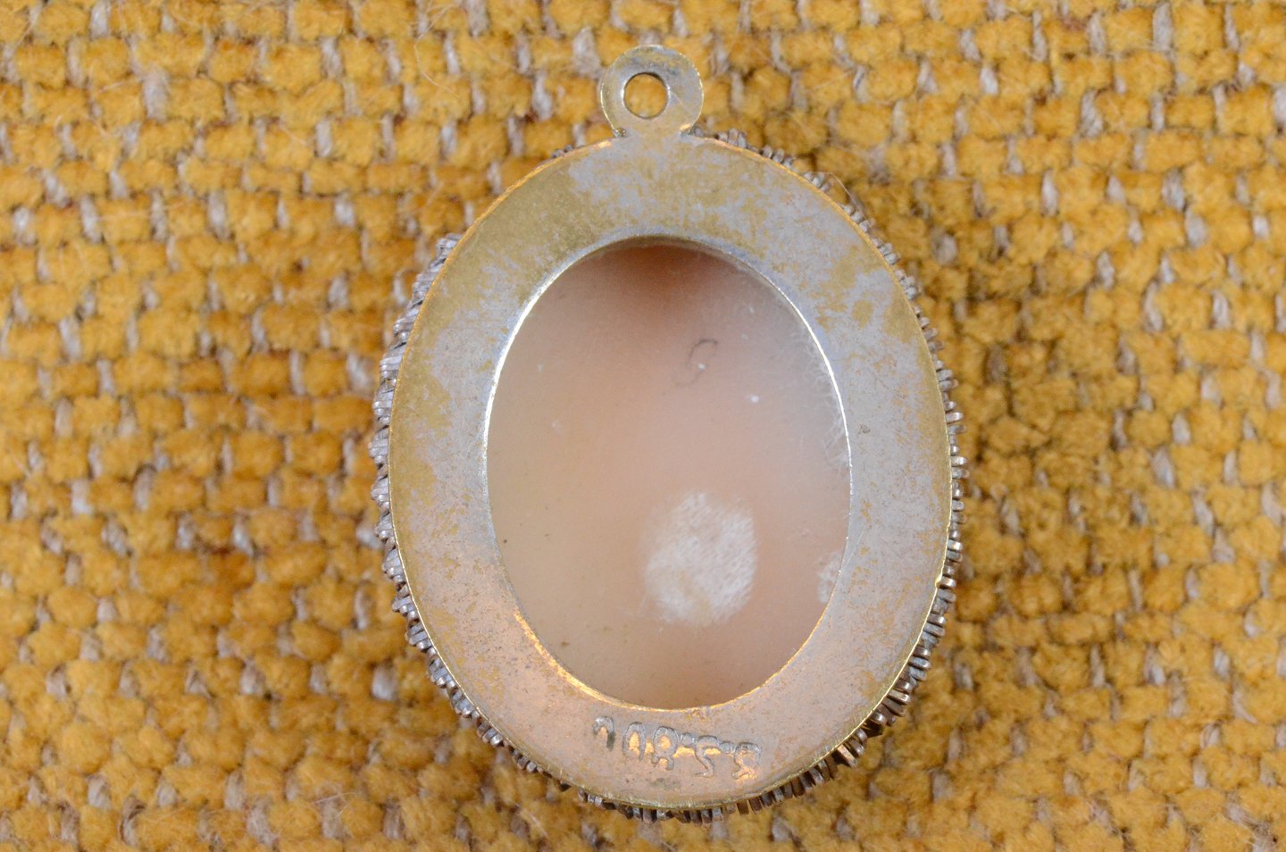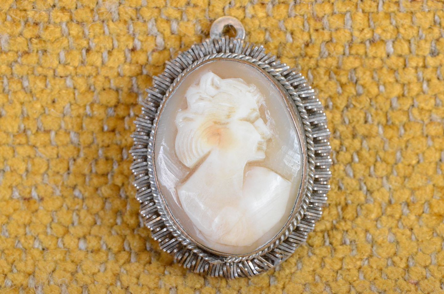 Camé mini vedhæng med damehoved skåret af konkylie, monteret i sølvramme fint dekoreret kant og omgivet af snoet bånd.