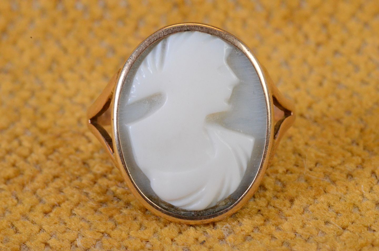 Camé ring af guld med romersk hoved skåret af hvid konkylie monteret i guldring. Str.: middel Art No. 51