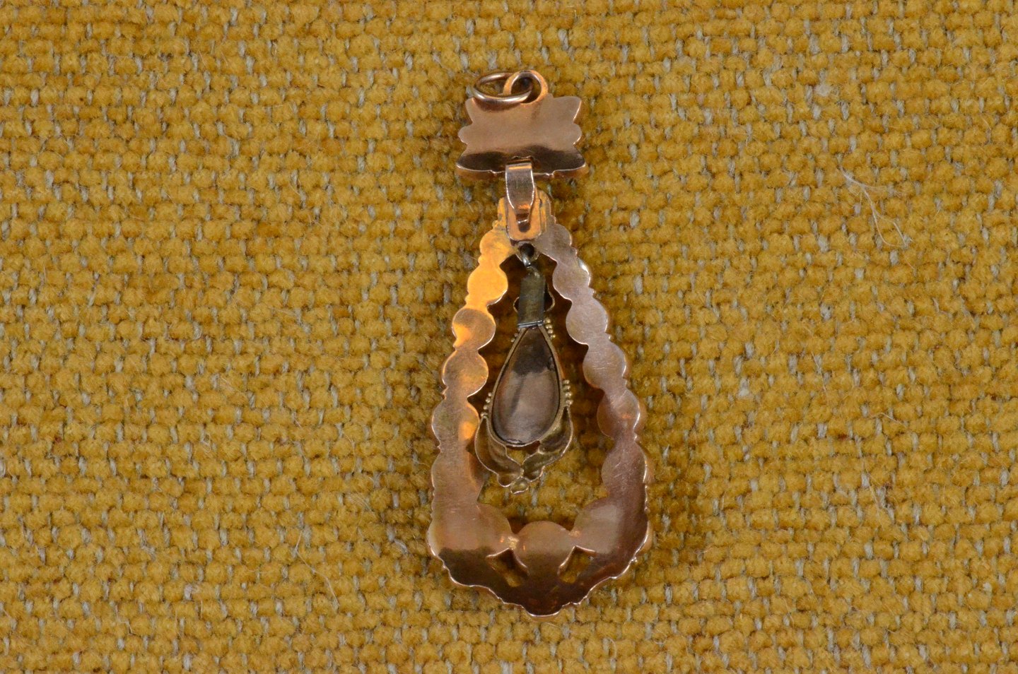 Bohemian Garnet Pendant of a small flower with an eyelet at the bottom. On it is hooked a teardrop pendant with loose hanging centerpiece of a big beautiful garnet. Gold plated silver decorated with leaf motifs. Nature. No. 91
