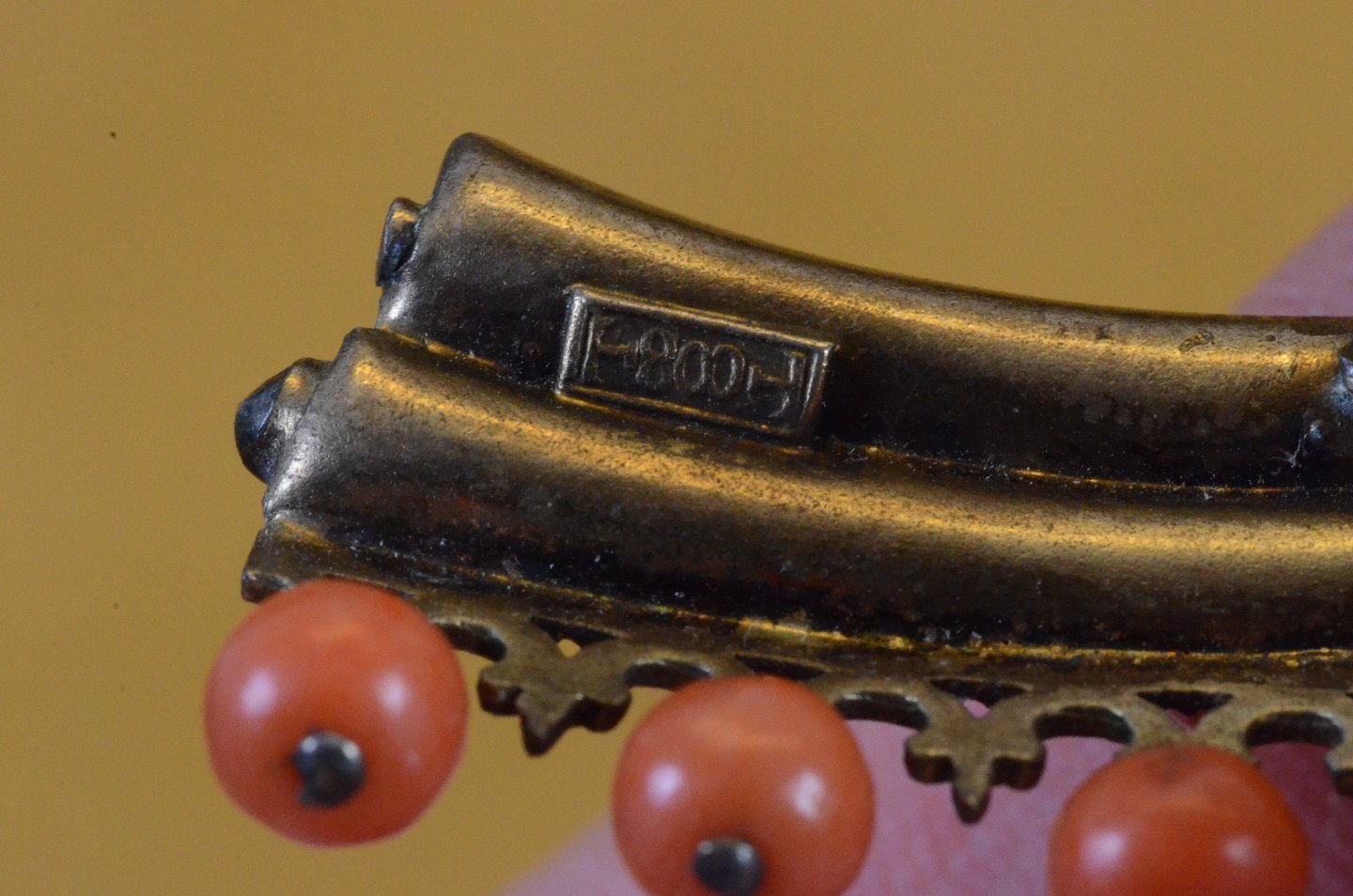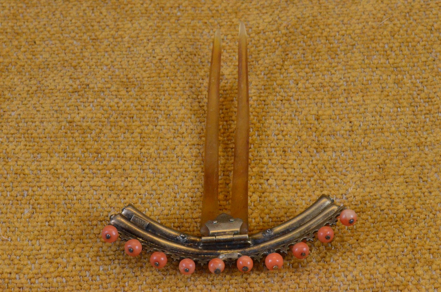 Hårnål af horn med koraler i 2buet rækker, smukt udskåret sølvrække prydet med 10 større koralperler. Str.: 6,5*1,8 cm, nålene 7 cm. Art.No. 103