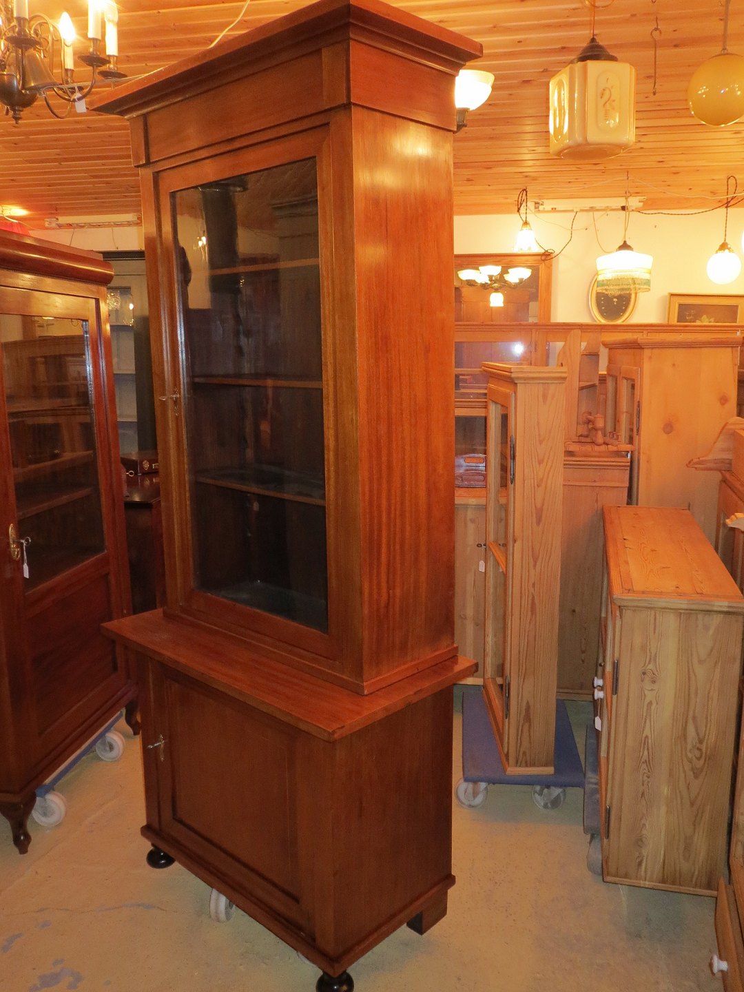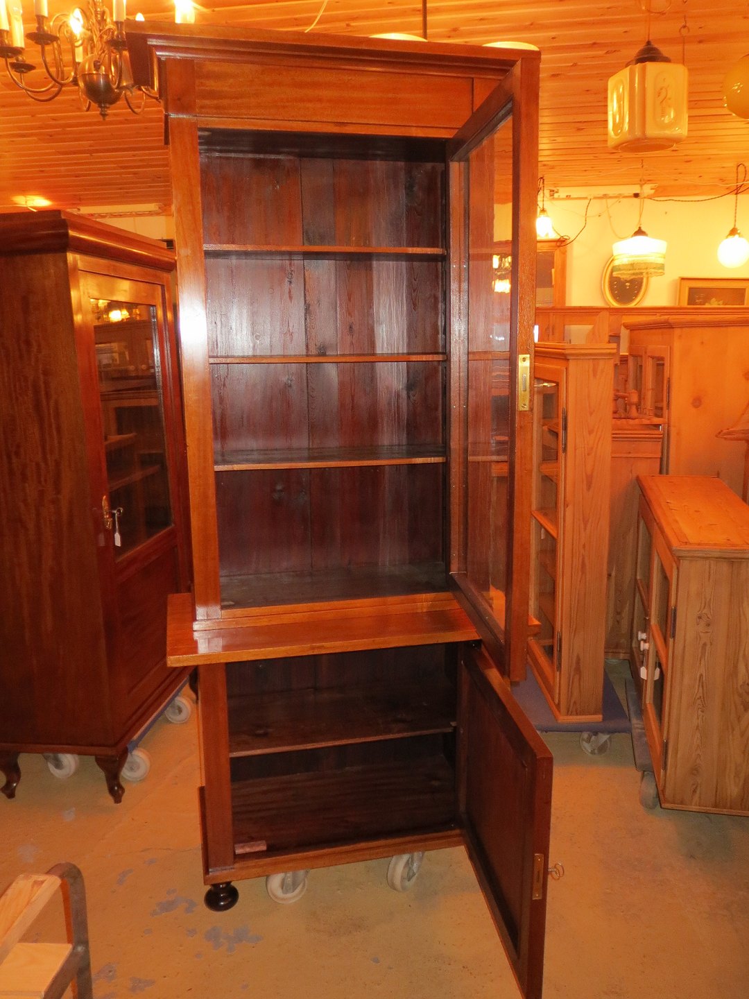 Mahogni Bogskab med 1 glaslåge 1 fast låge og flytbare hylder . Restaureret og håndpoleret mål H 185, B 84, D overskab 36, underskab 43,cm 2110/14-P