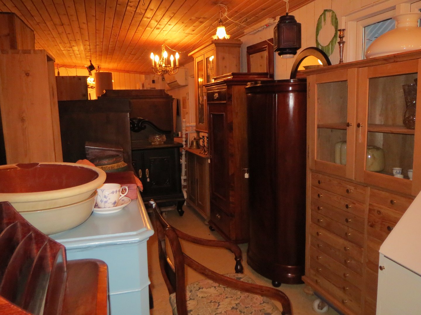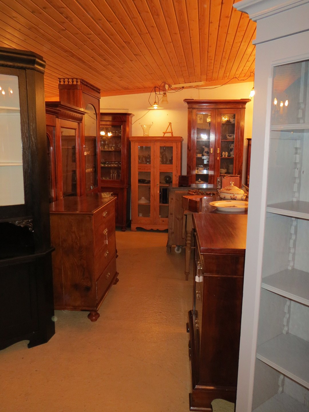 Stor salgsudstilling med restaurerede møbler håndpolerede mahognimøbler, afsyrede fyrretræsmøbler, malede træmøbler, kun originale gamle og antikke møbler.