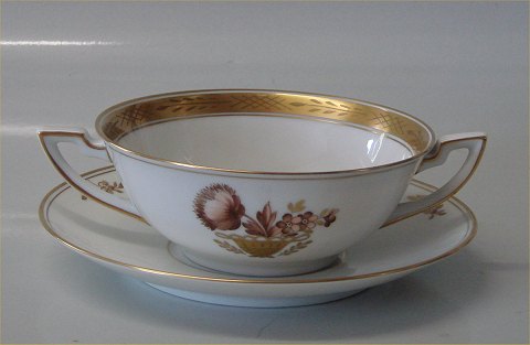 Kgl. 9571-595 Bouilionkop 17.5 cm og underskål 17 cm Royal Copenhagen Guld dekoration på hvidt porcelæn 1927. I hel og fin brugt stand Golden Basket Suppekop med ører