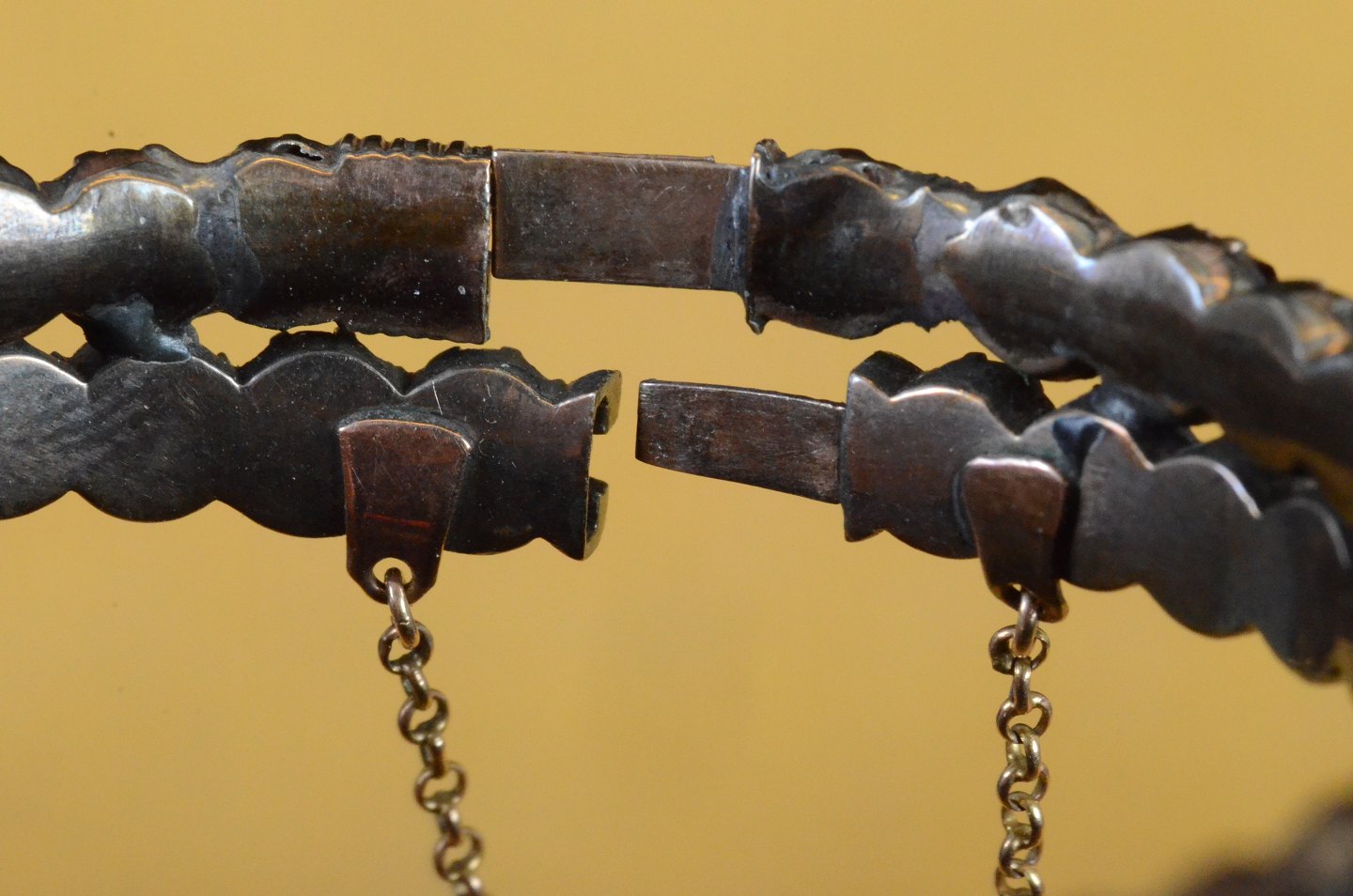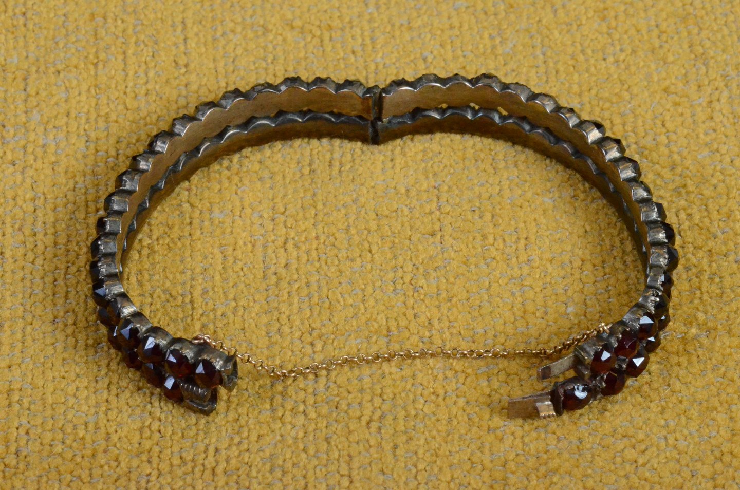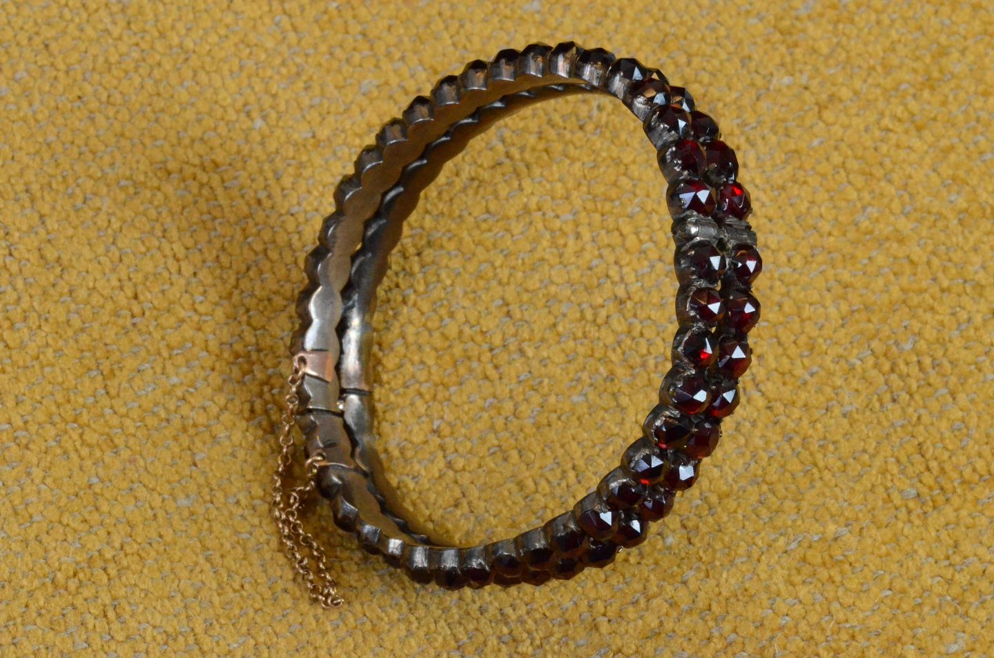 Antikt bøhmisk granat armring bestående af to række rosen facetslebne granater. Armbåndet er hængslet på den ene side og har et spænde på den anden med den oprindelige sikkerhedskæde. Forgyldt sølv. Størrelse: oval 5 * 6 cm. Art nr 106