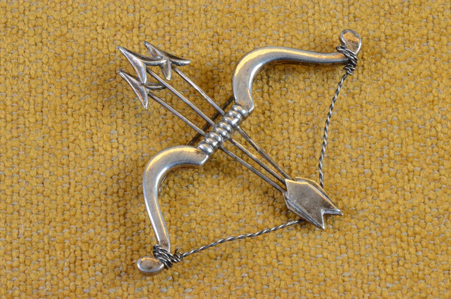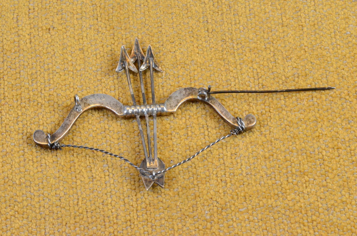 Broche af sølv formet som bue med 3 pile, smukt håndværk med spændt bue af snoet sølv. Stemplet 830 S. Str.: 8 * 6 cm. Art. No. 120