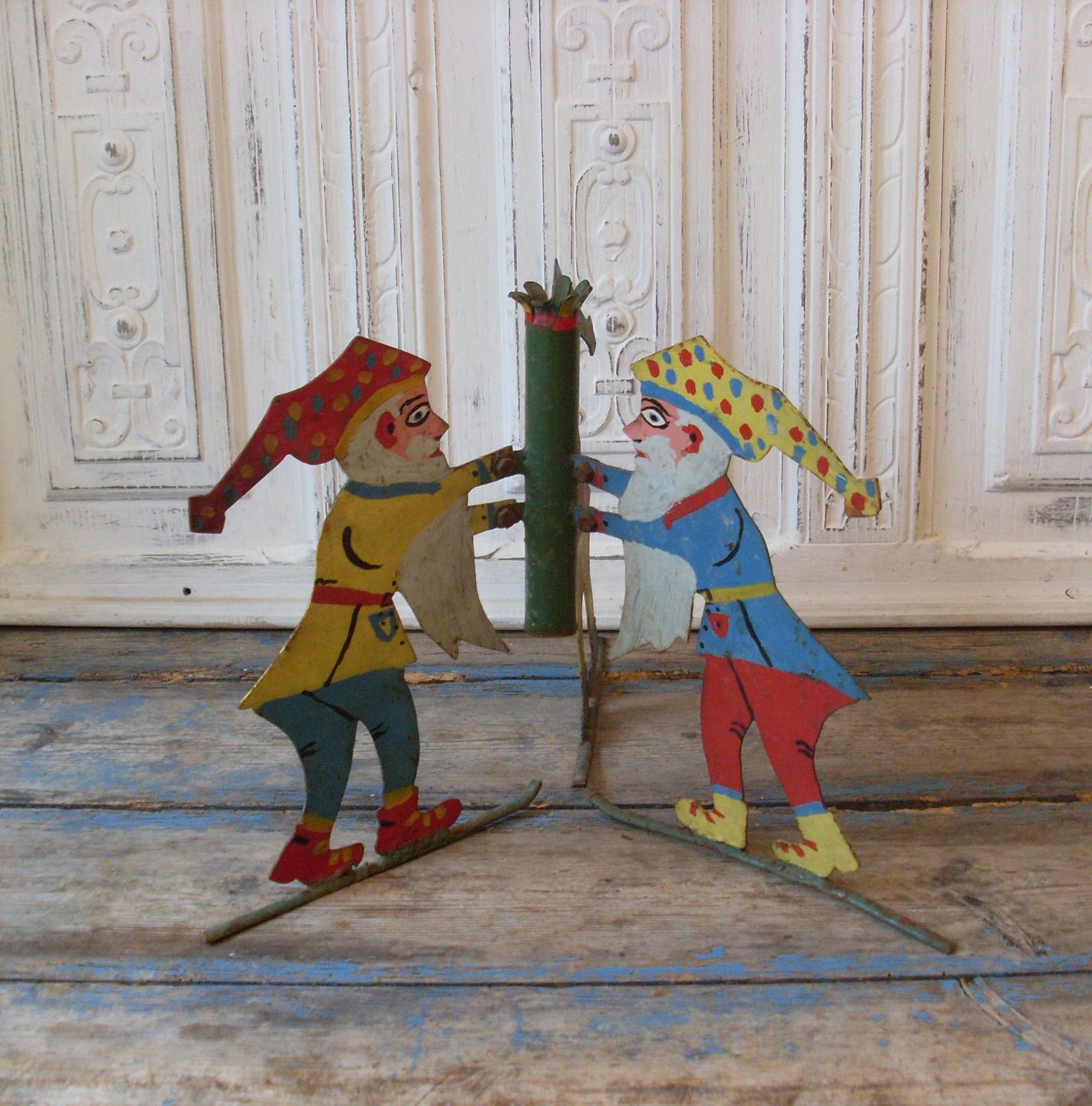 Gammel juletræsfod i bemalet jern i form af nisser på ski.