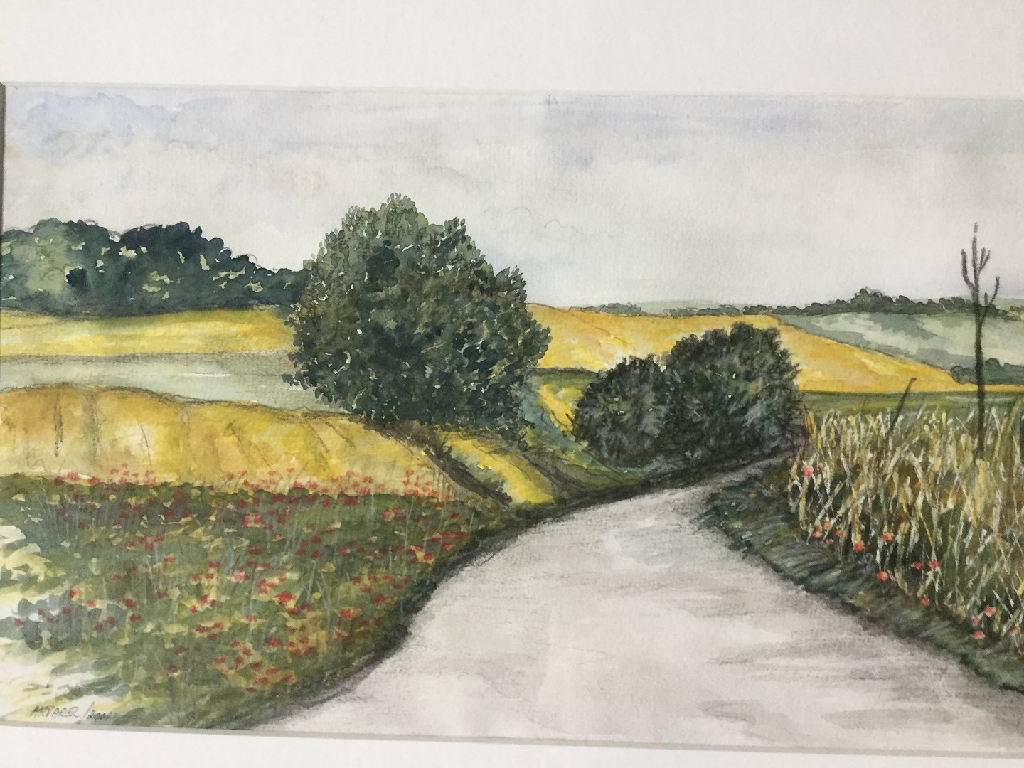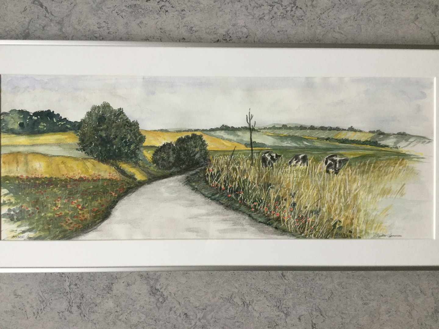 Akvarel af Ingelise Sørensen 2001 - Vej gennem landskab med sortbrogede køer.