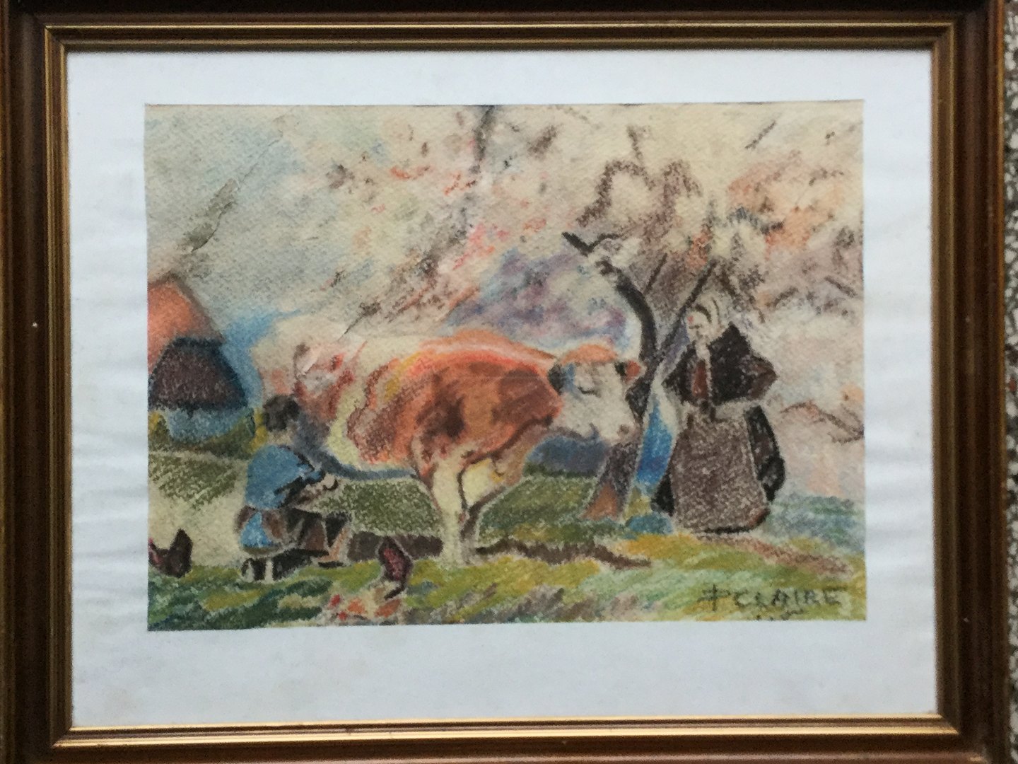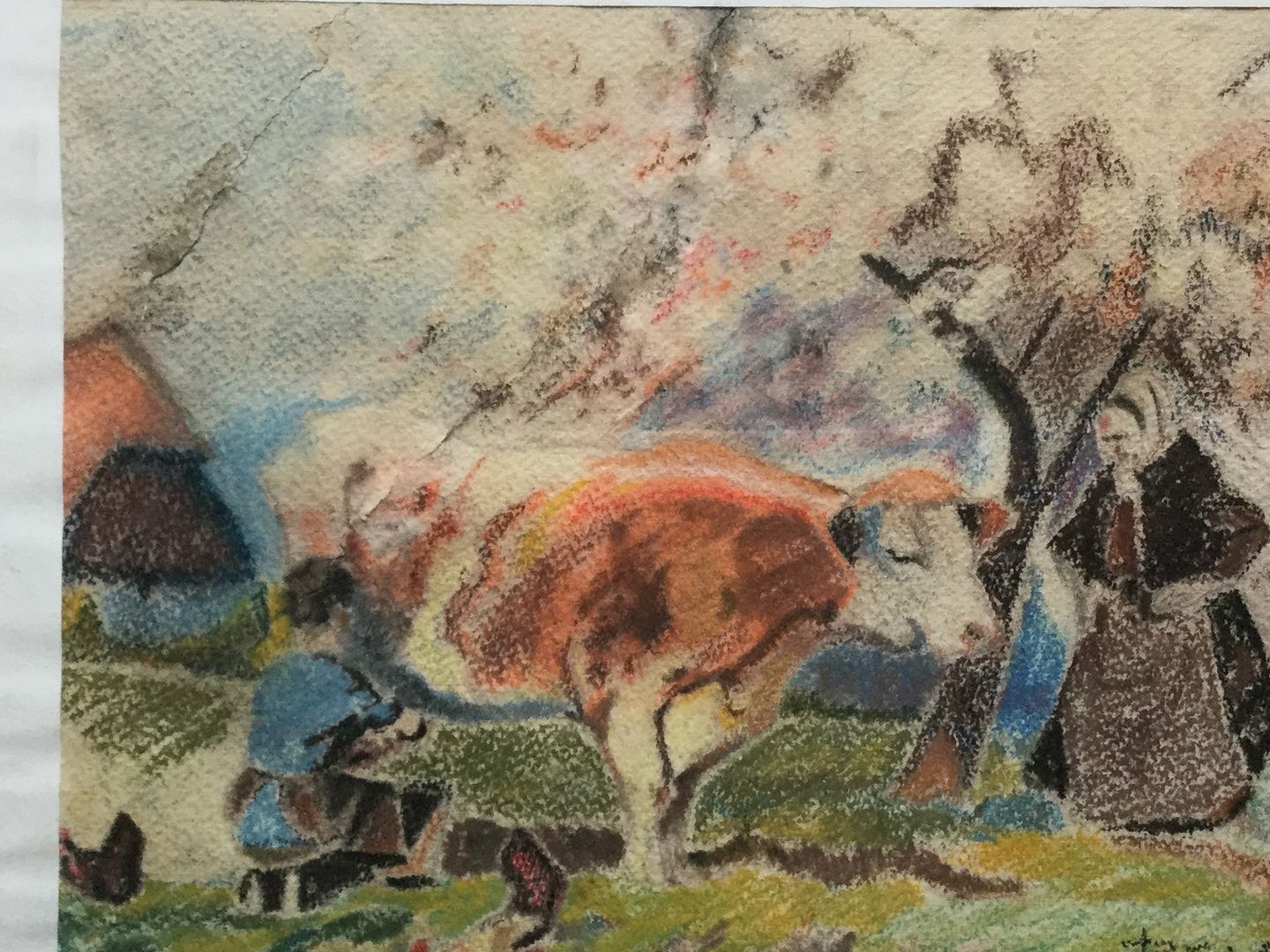 Text available in Danish: Oliekridt af Auguste Jean Claire 1945 - Kvinde der malker ko.