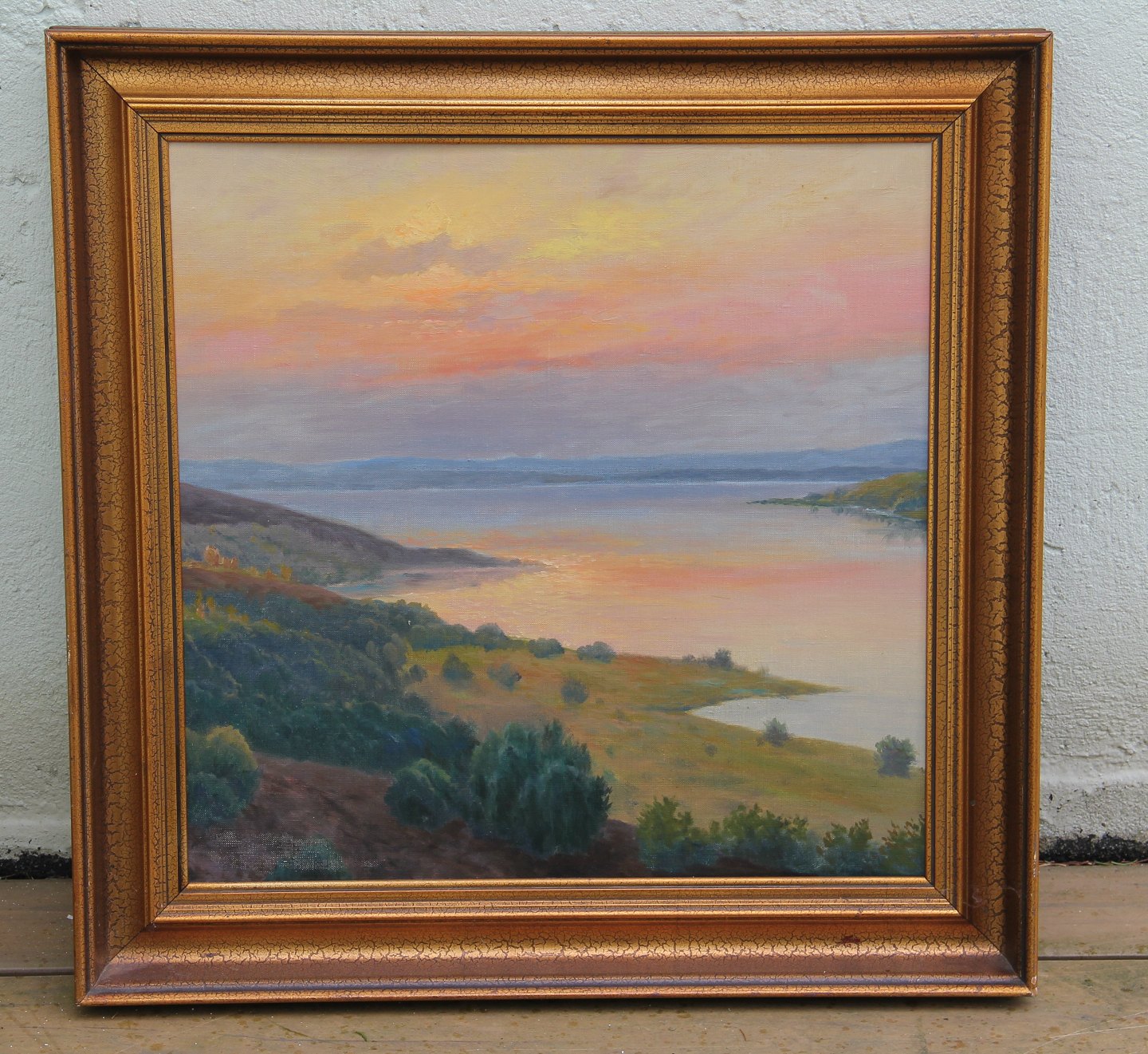 Painting: Sea Mariagerfjord Hugo Petersen B. 1876 66 x 66 cm Painting on board in Old Wooden frame 1955