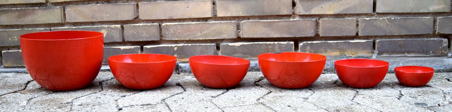 9 skåle, emaljeret metal, Finel, Finland, 1950´erne.