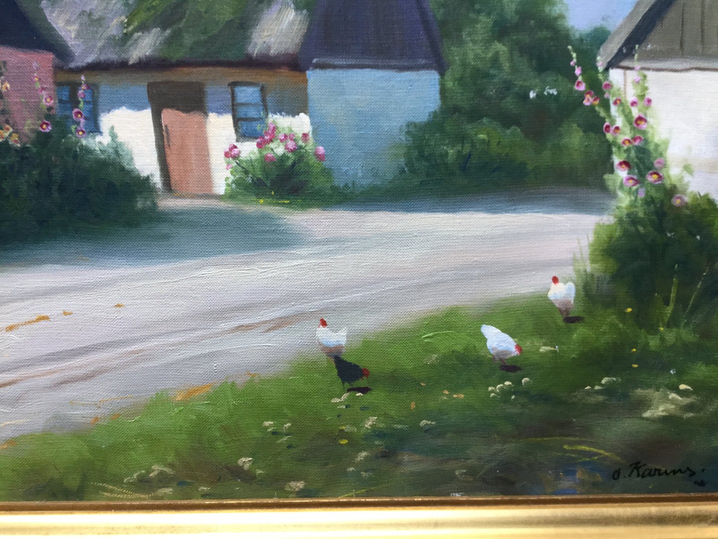 Maleri af Osvald Karms - Landsbygade med stokroser og høns.