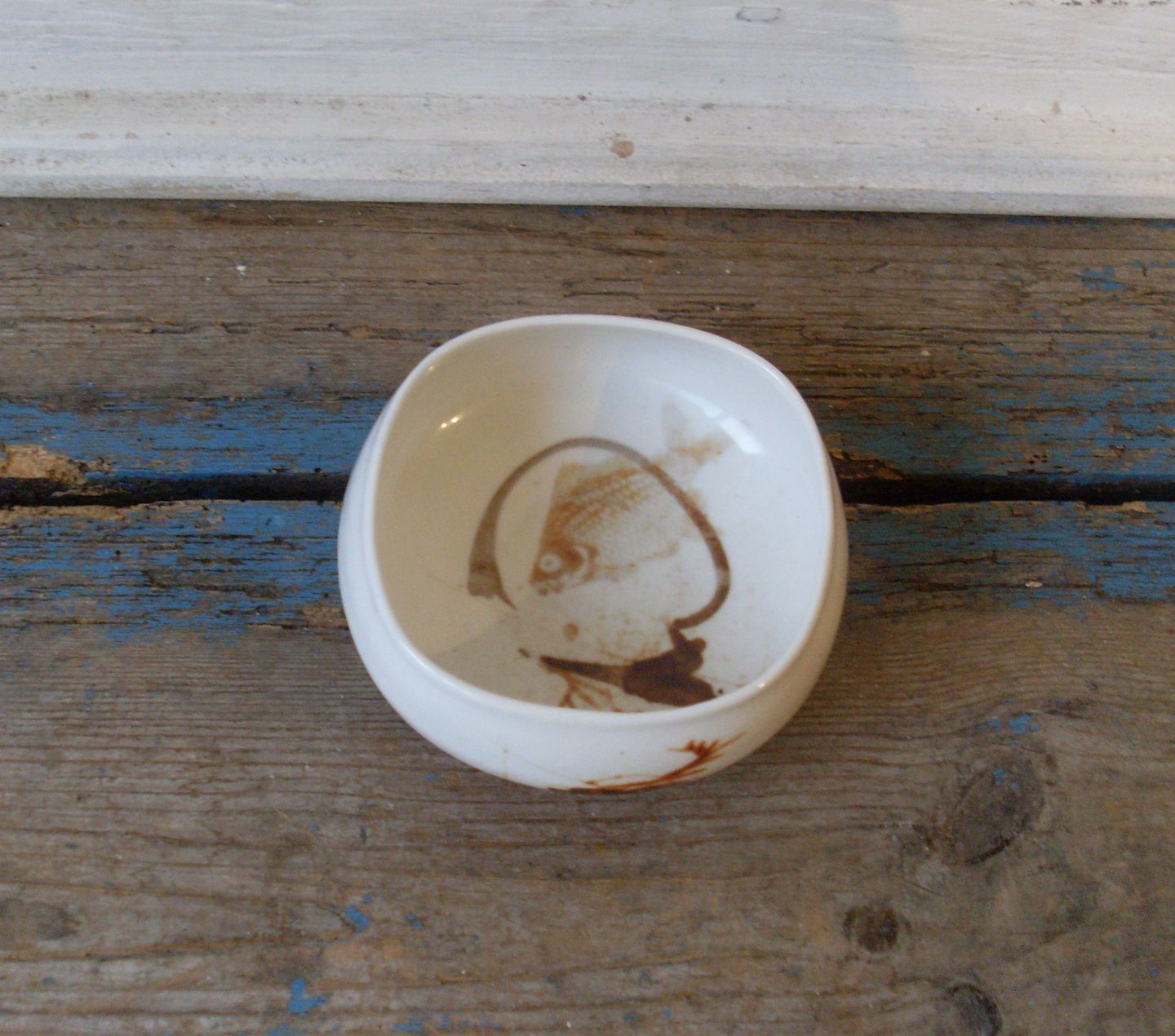 Niels Thorsson for Royal Copenhagen unika skål, dekoreret med håndmalede fisk i rød jernglasur.