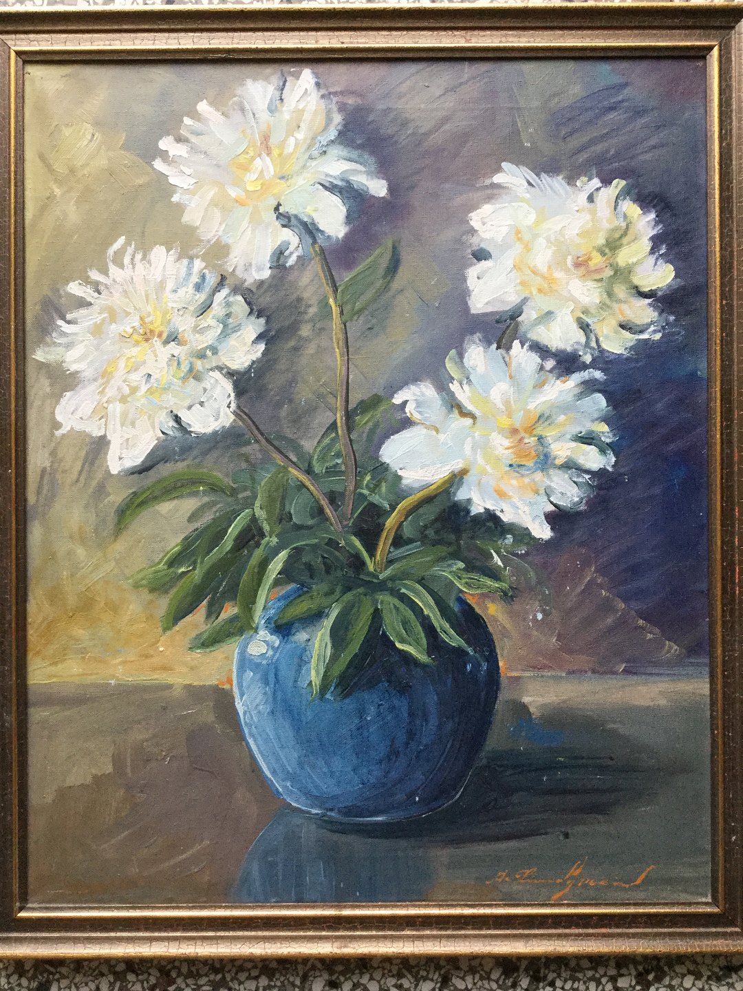 Blå vase med hvide pæoner.