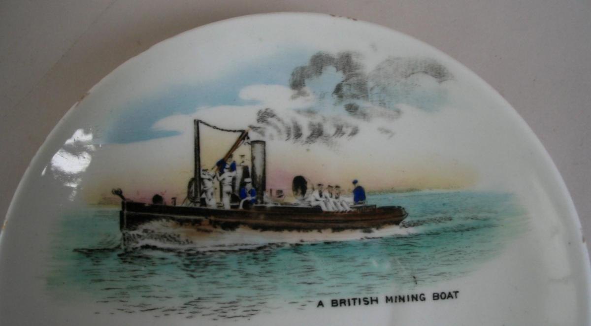 Engelsk kop i hvidt porcelæn med underkop, o. 1900, stemplet: Shelley China, England, med motiver i overføringsteknik af "British Battleship" på kop og " A british Mining Boat" på underkop. Polykrom bemaling og emalje. Med guld på kanter. Højde kop.: 7 cm. Dia. underkop.: 14 cm.