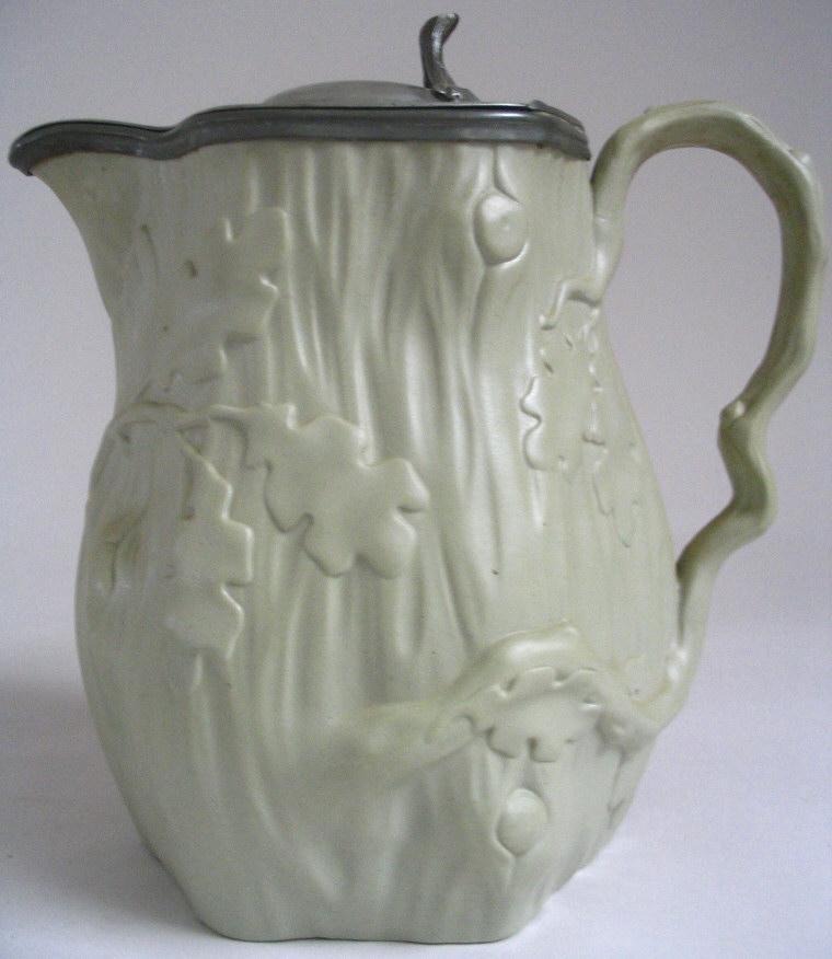 Engelsk kande, 19. årh. i bisquit med låg i tin. Dekorationer i form af træ og egeløv. Stemplet i bund. Stemplet i låg: Ergadhead & Atkim. H.: 22 cm.