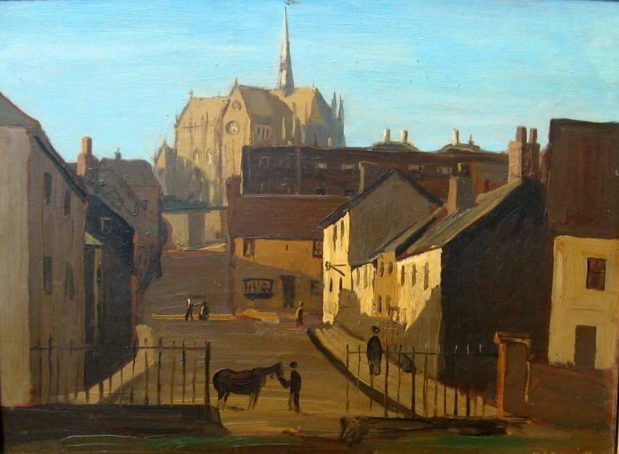 Padwick, Philip Hugh (1876 - 1958) England: Parti fra Arundel, England, med Domkirken og folk på gaderne. Olie på træ. Signeret: Padwick. 33 x 42 cm. På bagsiden med label med titlen: Streetscene, Arundel. I en forgyldt ramme.