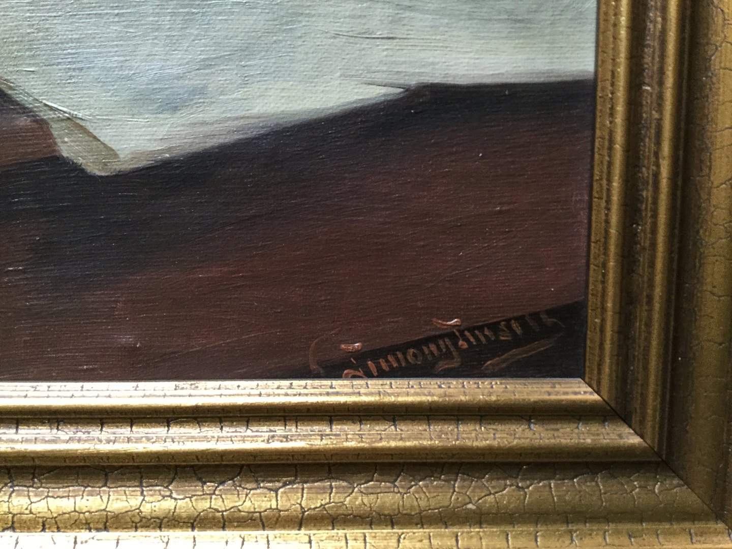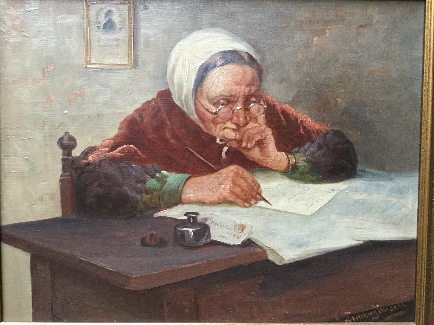 Maleri af Simony Jensen - Gammel kone skriver brev i stuen.