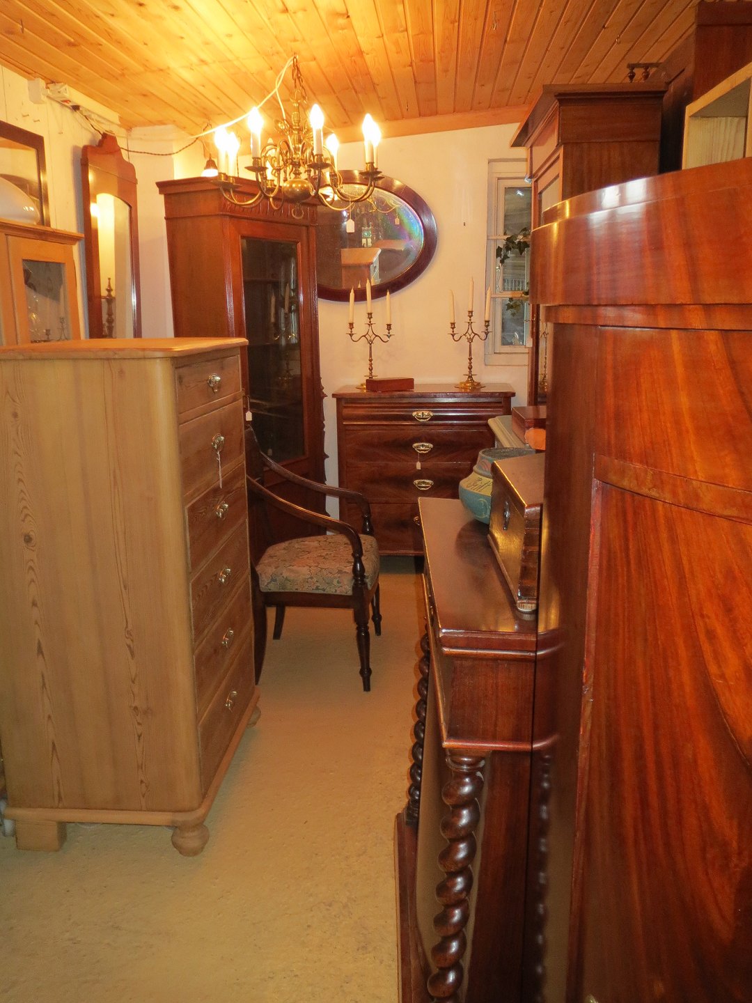 Stor salgsudstilling med restaurerede møbler håndpolerede mahognimøbler, afsyrede fyrretræsmøbler, malede træmøbler, kun originale gamle og antikke møbler.