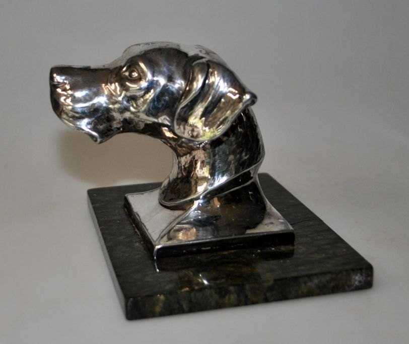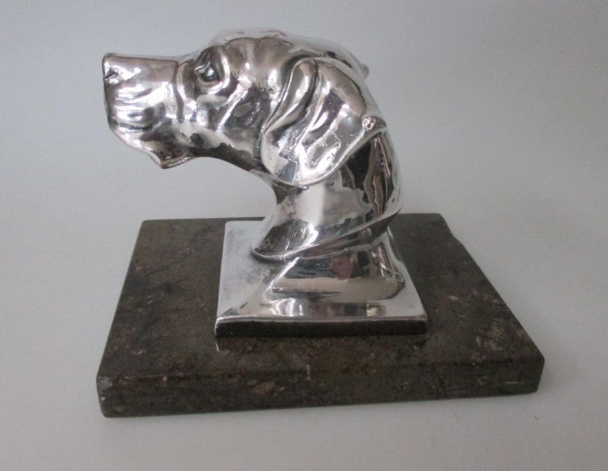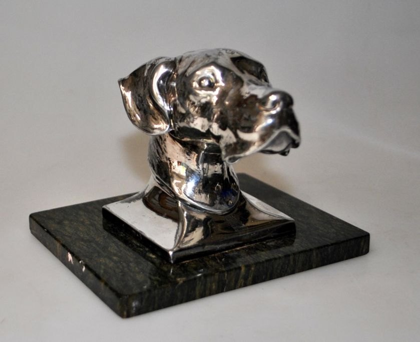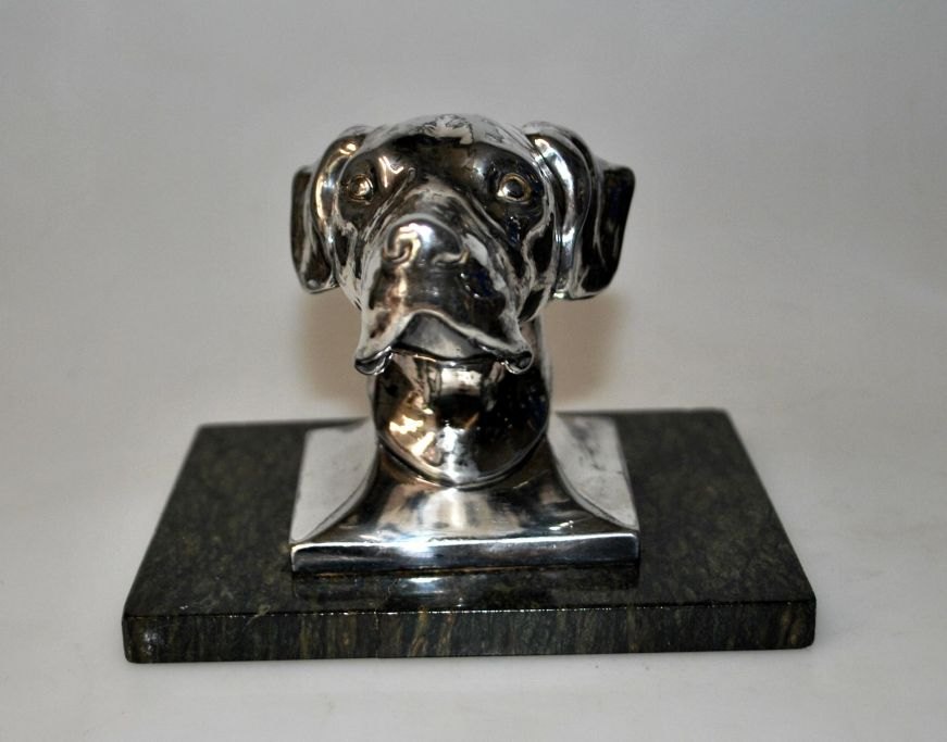 Letter Press as a dog, 20th century. Silver-plated copper. Height .: 11,5 cm. B .: 9 cm. H .: 9.5 cm. On plinth of marble. NB: 2 in stock!
