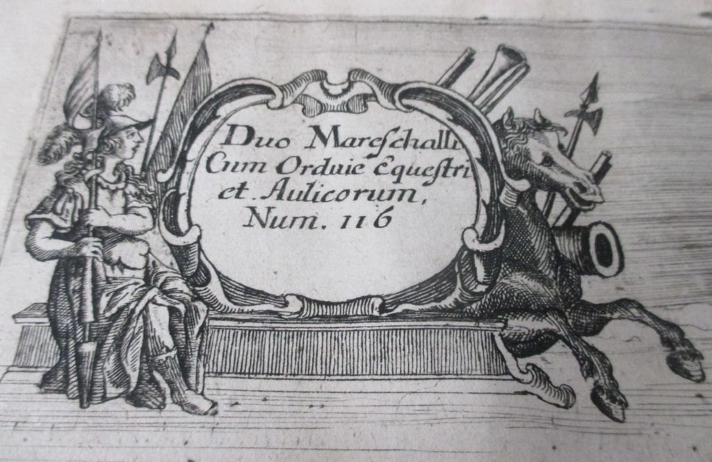 Duo Mareschalli Cum Orduie Equestri et Aulicorum, Num 116. Kobberstik fra midten af 1600-tallet. Illustration no. 7 fra bog værket: Christiano-Albertinæ Inavgvratio.