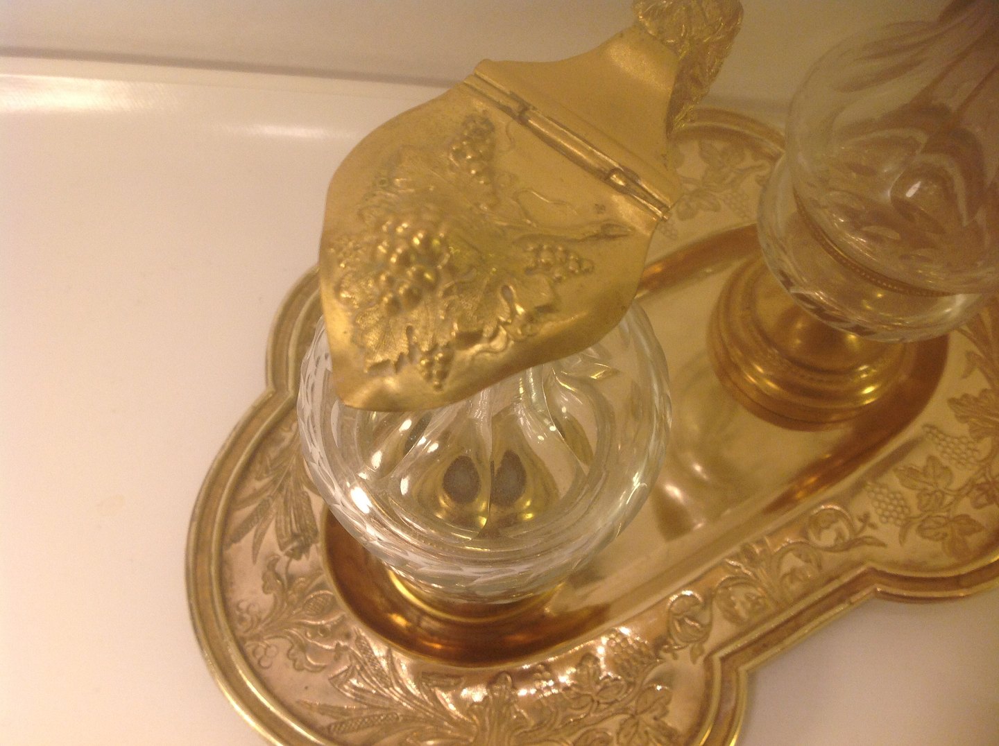 Bestående af to krystal flaconer hvor af den ene med vindrue løv på og den anden med snegle på låg.