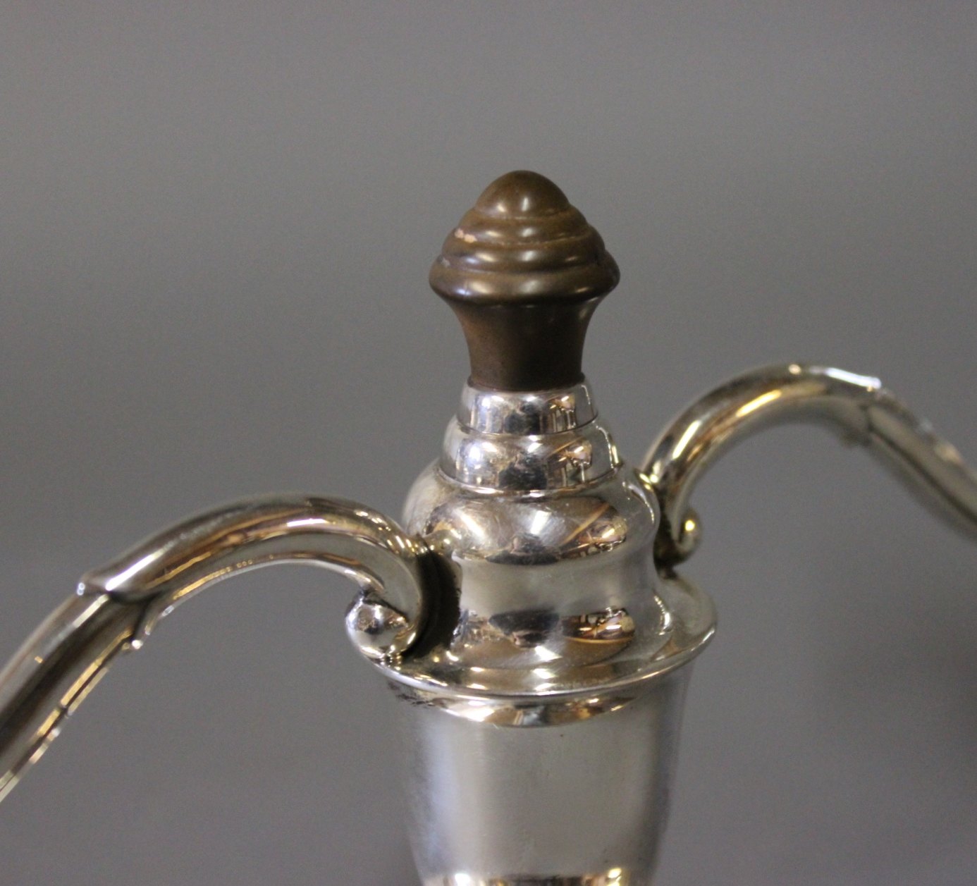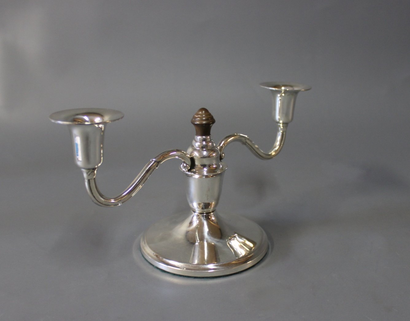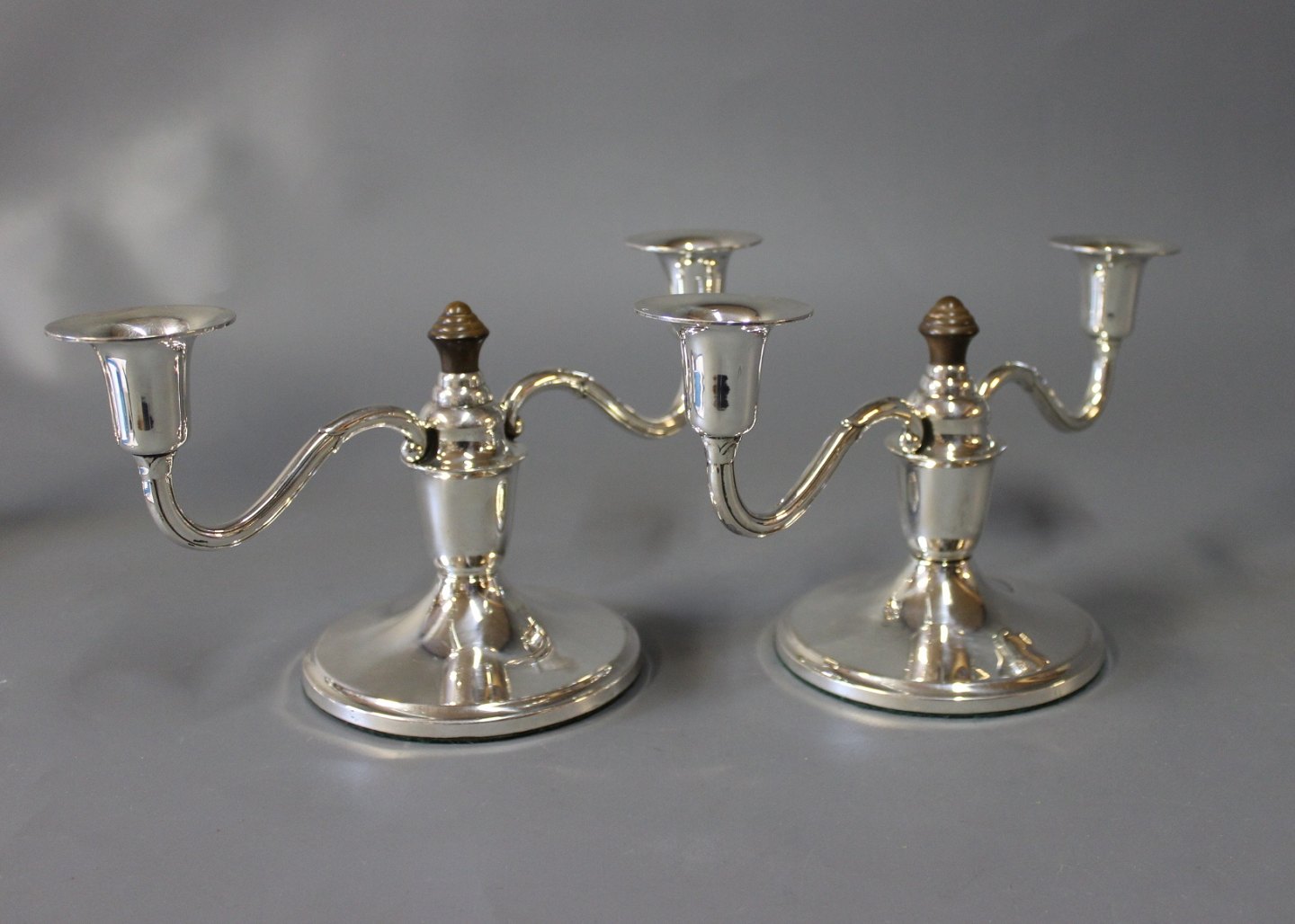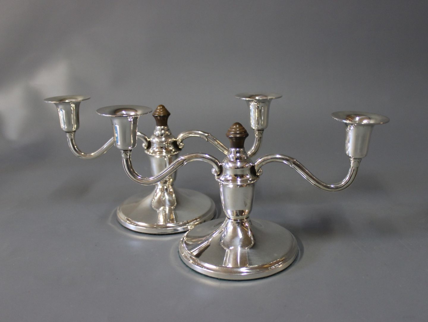 Et par toarmede stager i tretårnet sølv og dekoreret med ibenholt, stemplet SJ.