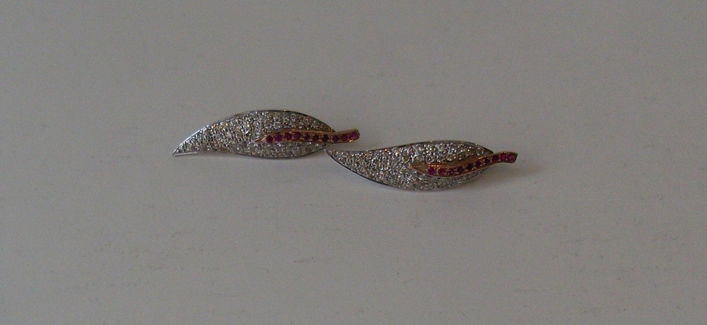 Par bladformede ørestikker i 8 kt hvidguld prydet med adskillige rubiner og diamant