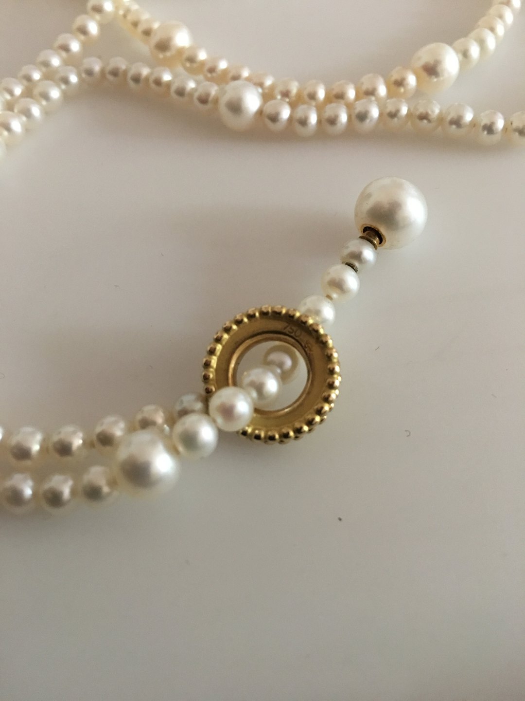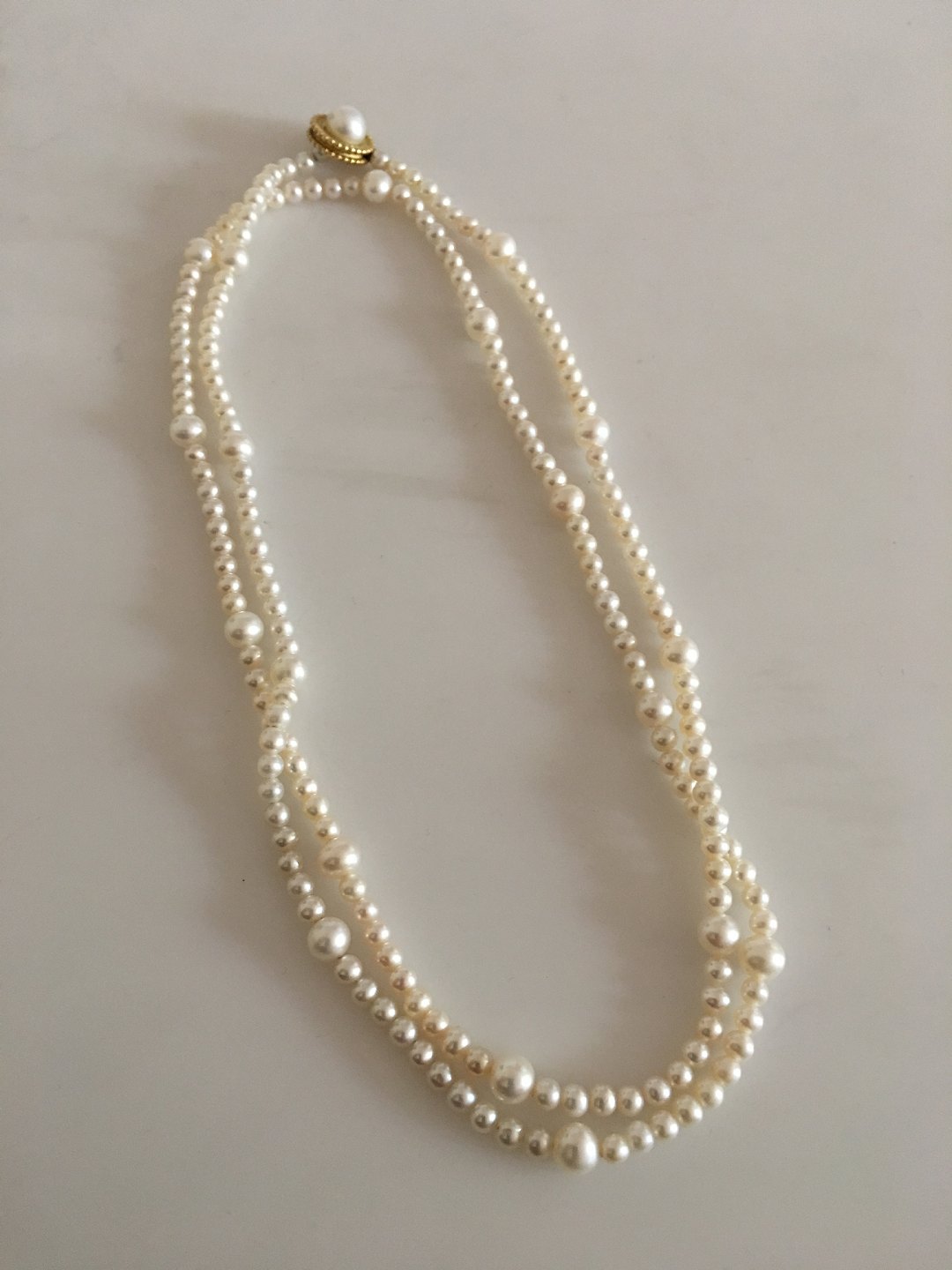 Georg Jensen Collier med Hvide Ferskvandskulturperler og Guldlukning. 88 cm L. Kuglerunde perler i flot stand. Flere styling muligheder. Perlerne er 4mm og de store 7mm