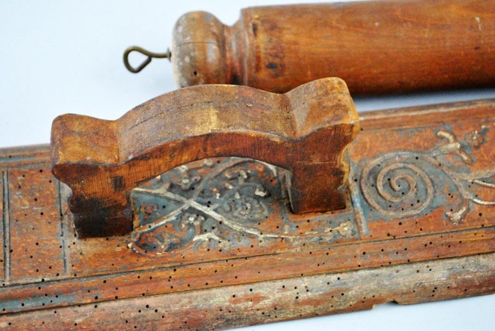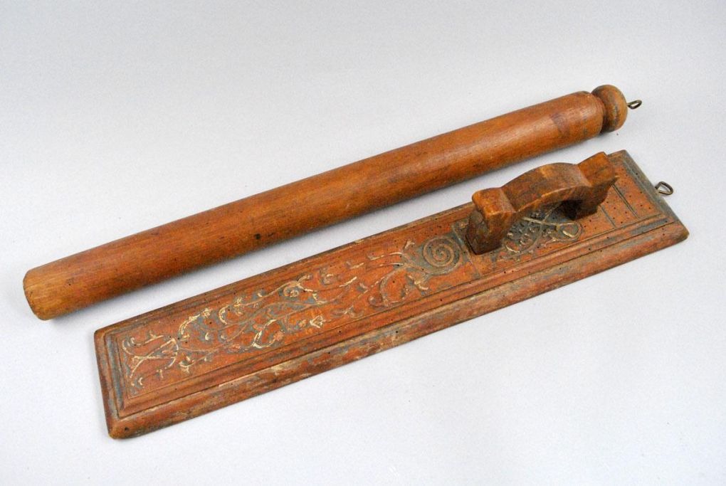 Mangleboard, 18th century. Denmark. Scratch-cuts in beechwood with remnants of paintings in blue and white. In adddition a roll.