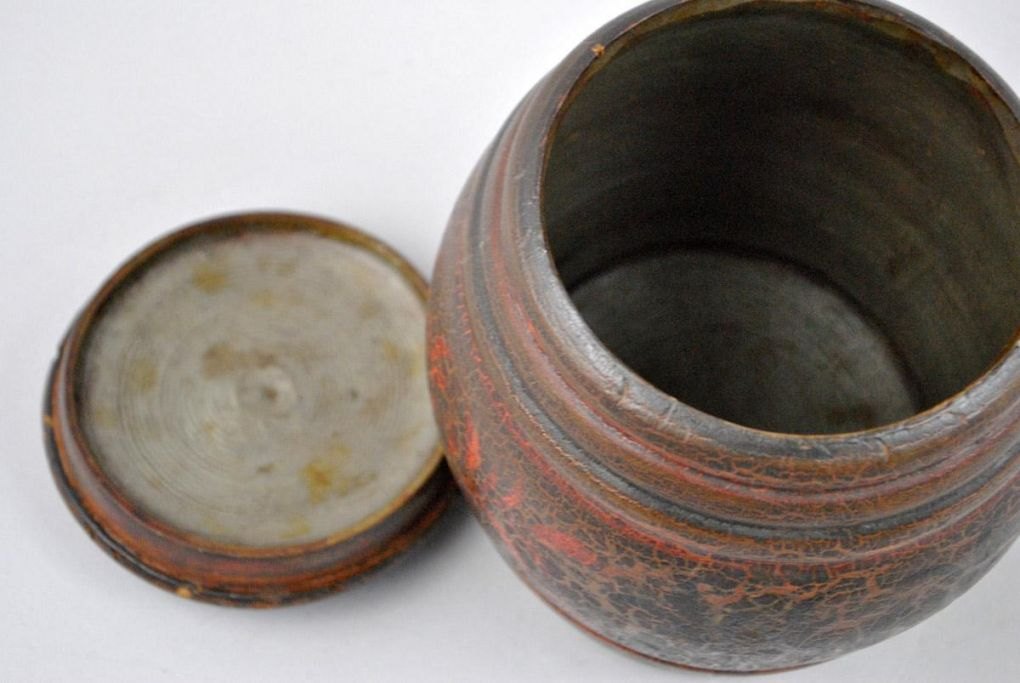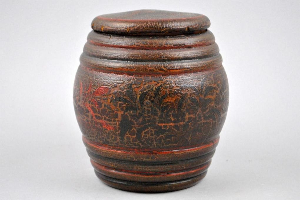Russian wooden jar. 19th. Decorated. H: 15 cm.