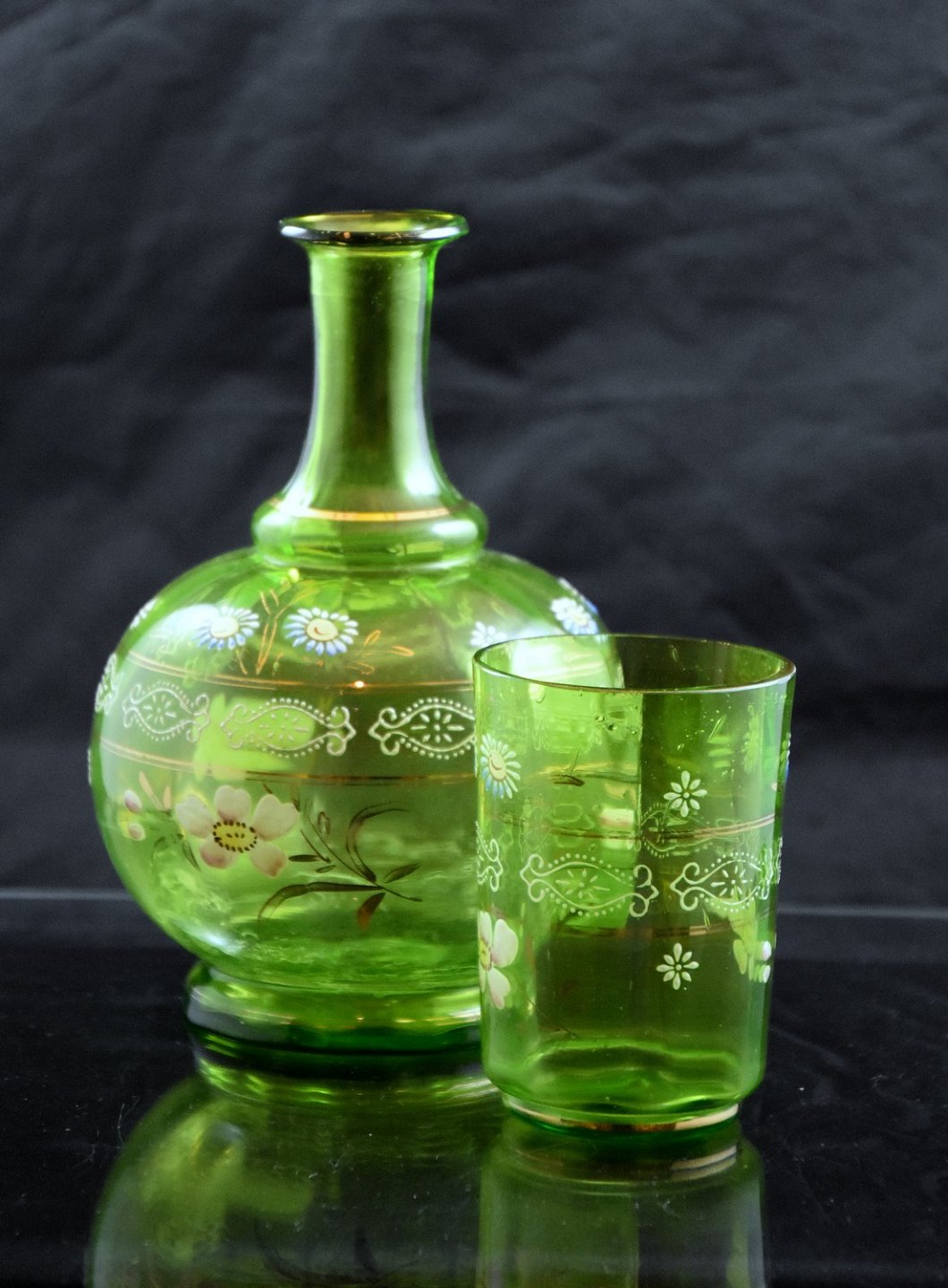 Natbordskaraffel med drikkeglas, grønt glas med bemaling.