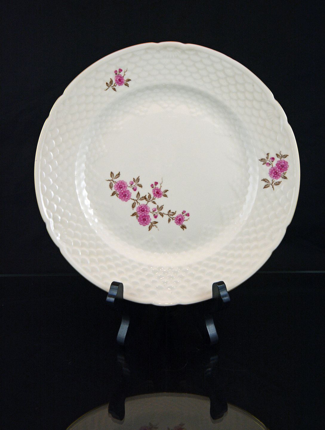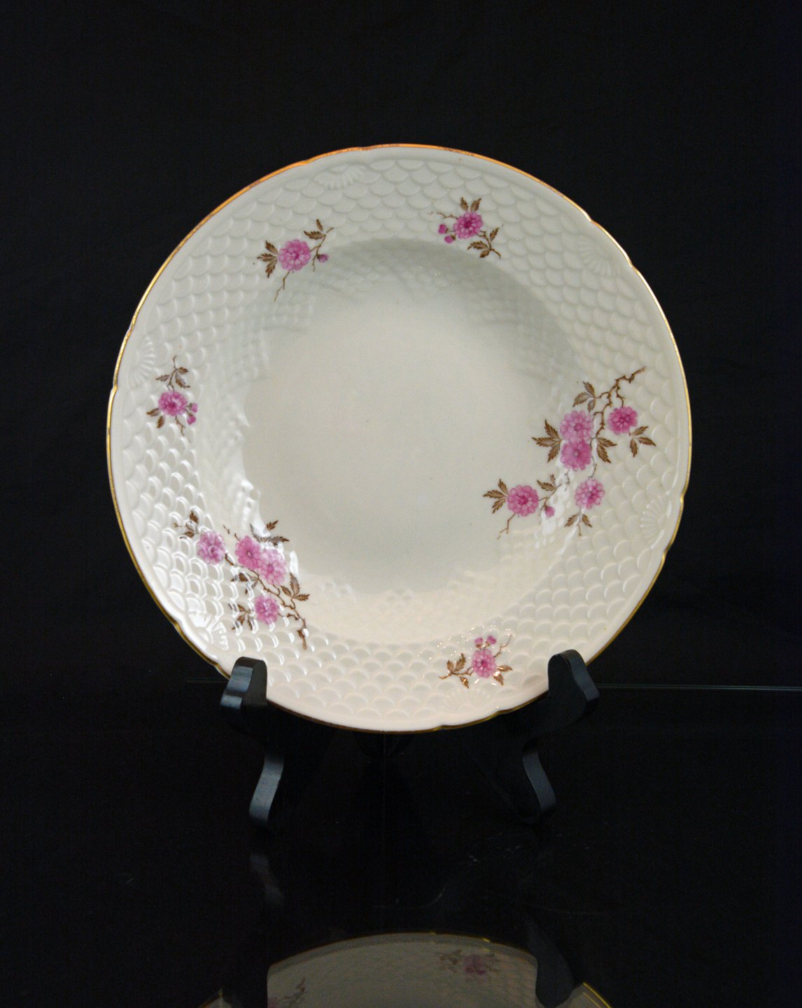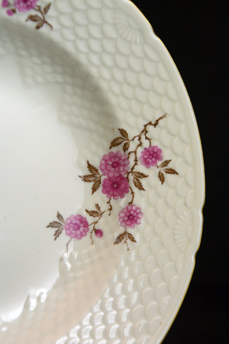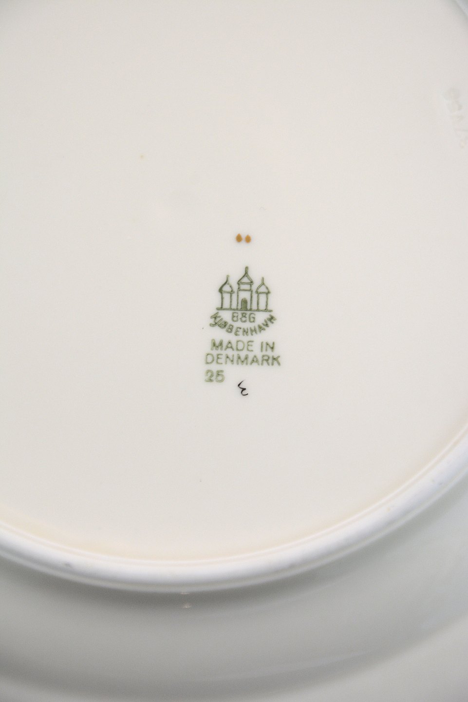 Text available in Danish: Stellet Volmer fra Bing og Grøndahl. Skelform med guldkant og motiv af pink blomster. Enkelte brugsspor kan forekomme.